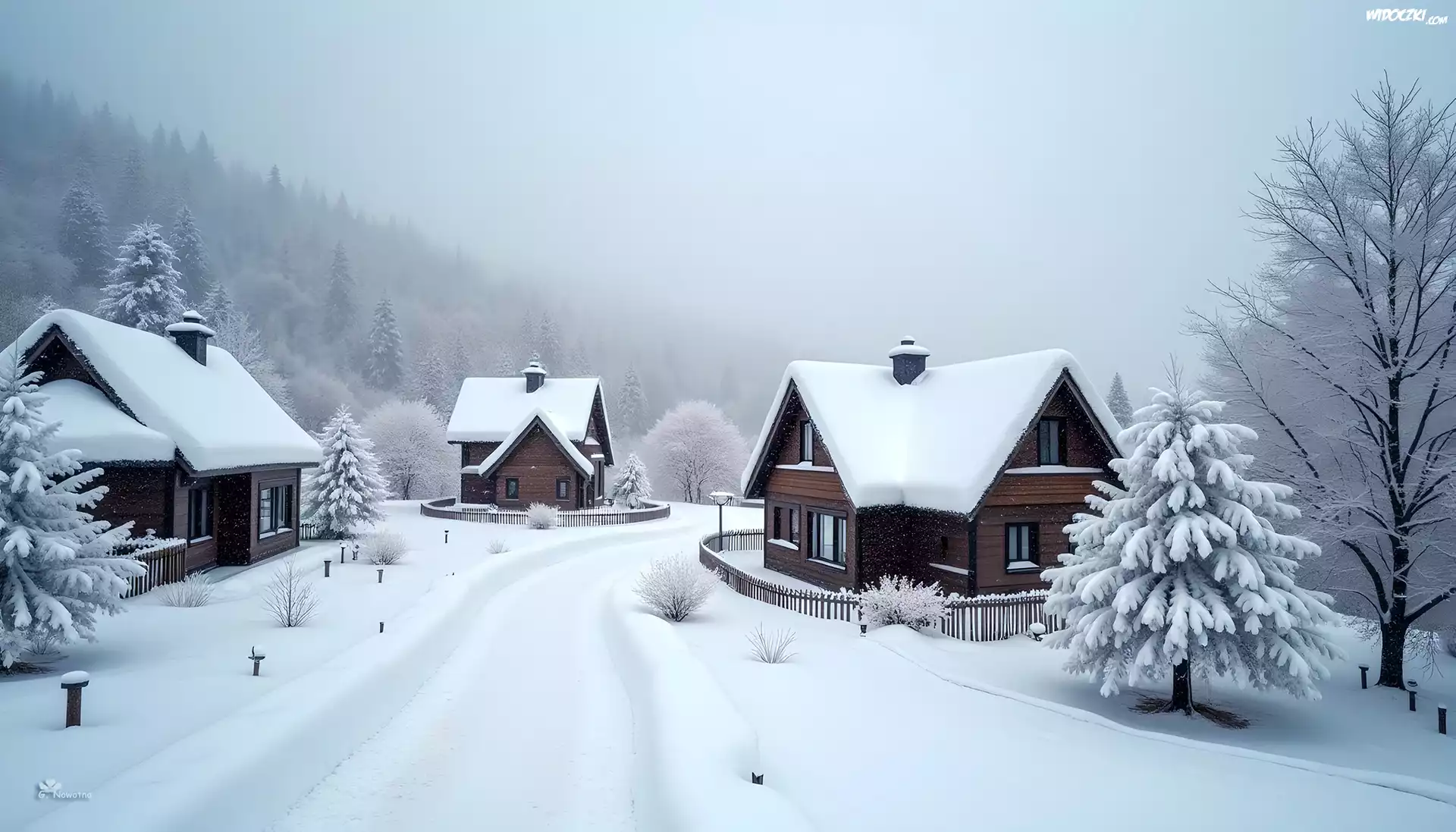 Ośnieżone, Domy, Droga, Zima, Grafika