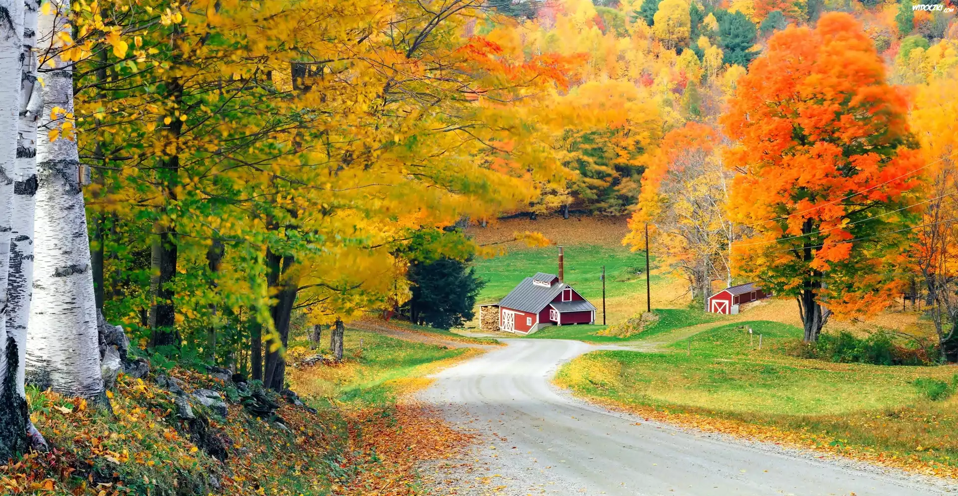 Zdjęcia, Droga, Domy, Kolorowe, Drzewa, Las, Wioska, Jesień