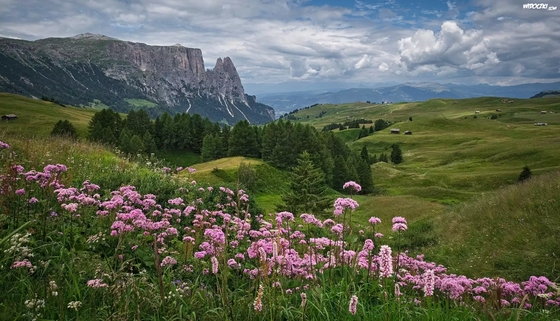 Zdjęcia, Góry, Las, Drzewa, Domy, Łąka, Roślinność, Chmury
