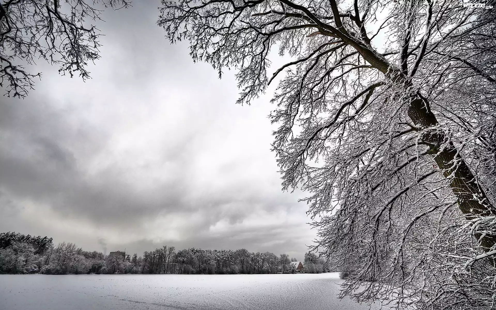 Domy, Zamarznięta, Rzeka, Drzewa Zima