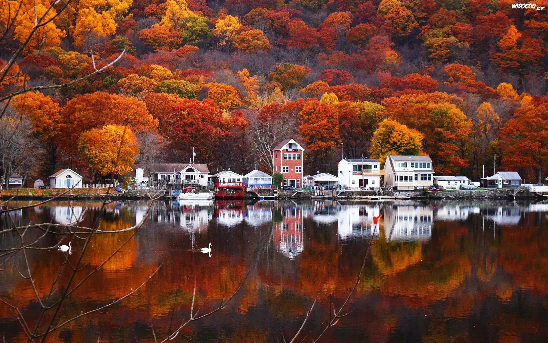 Zdjęcia, Jesień, Wzgórze, Drzewo, Domy, Jezioro, Łabędzie, Odbicie