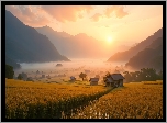 Zdjęcia, Pola, Dolina, Góry, Domy, Mgła, Drzewa, AI