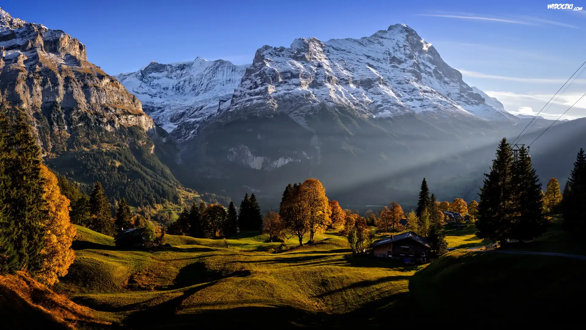 Zdjęcia, Szwajcaria, Kanton Berno, Wieś Grindelwald, Góry, Alpy Berneńskie, Drzewa, Domy