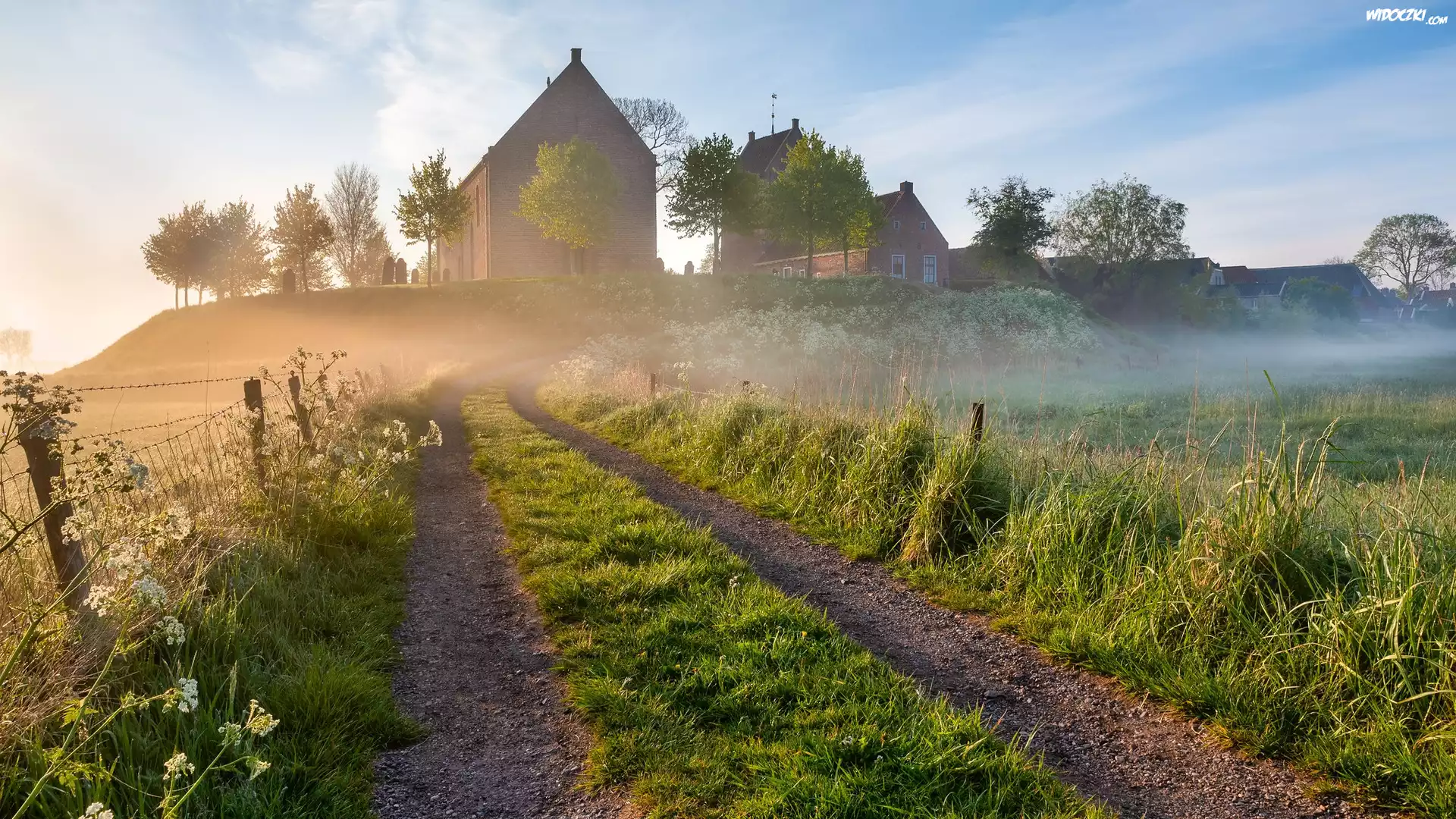 Zdjęcia, Pola, Droga, Mgła, Domy, Wioska, Ezinge, Holandia