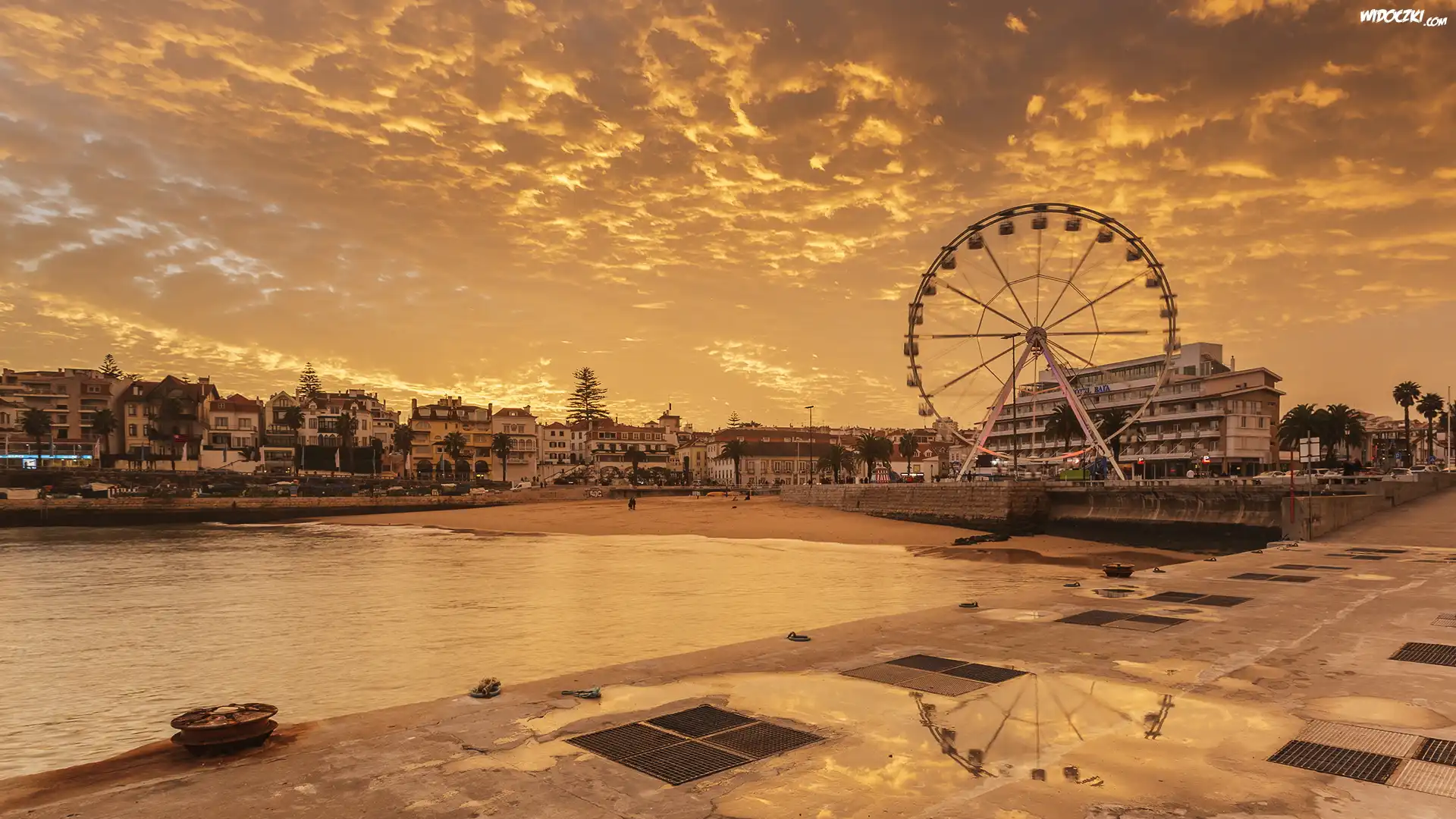 Zdjęcia, Miasto, Domy, Koło widokowe, Chmury, Wschód słońca
