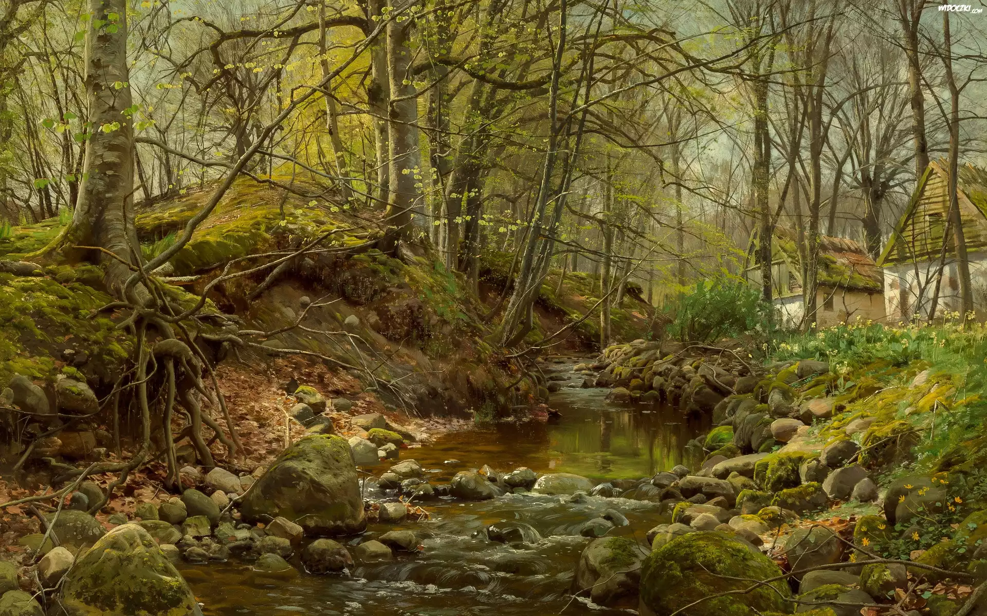 Zdjęcia, Malarstwo, Peder Mork Monsted, Las, Drzewa, Rzeka, Kamienie, Domy