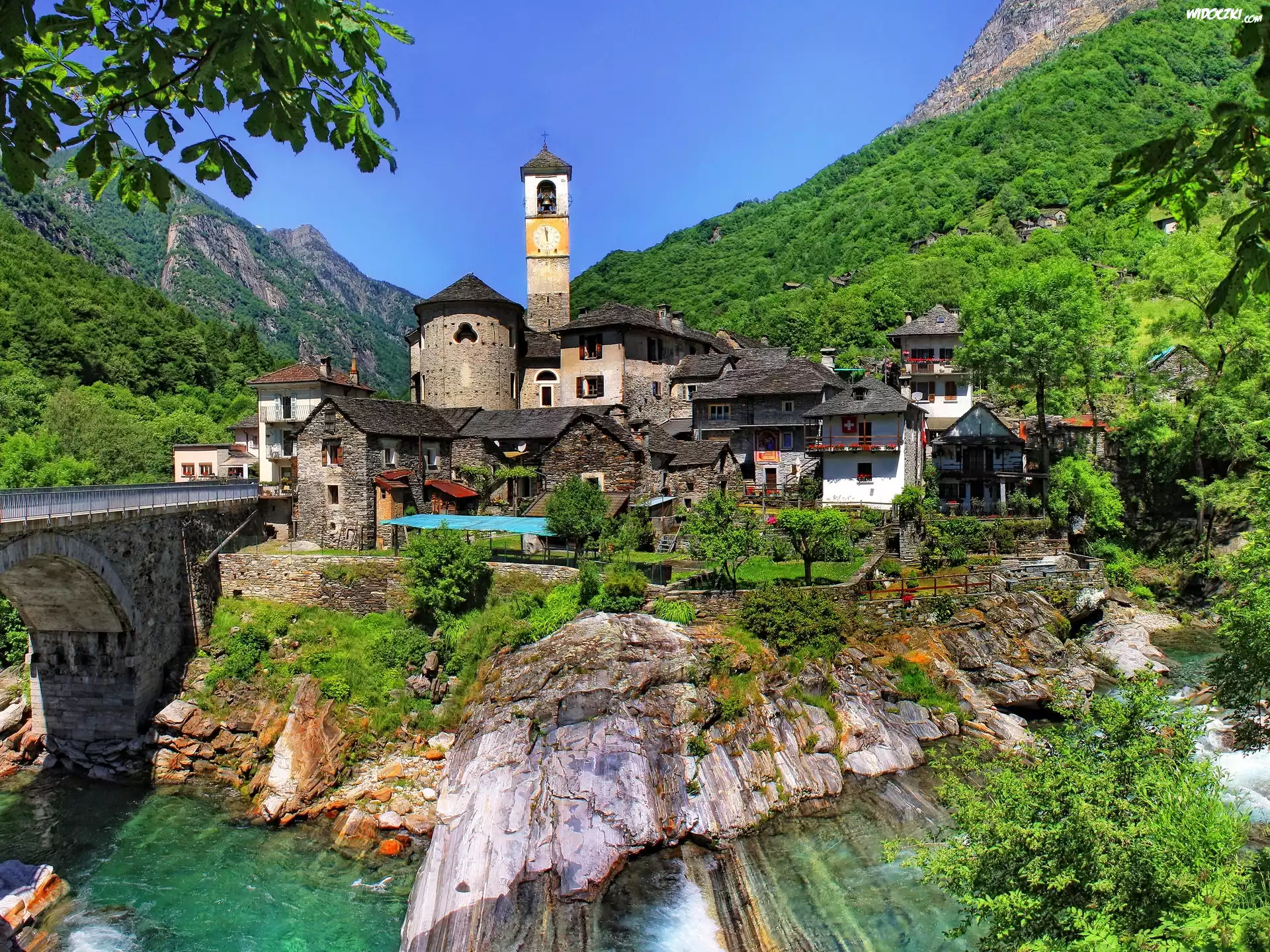 Zdjęcia, Domy, Dzwonnica, Góry, Rzeka, Most, Zieleń