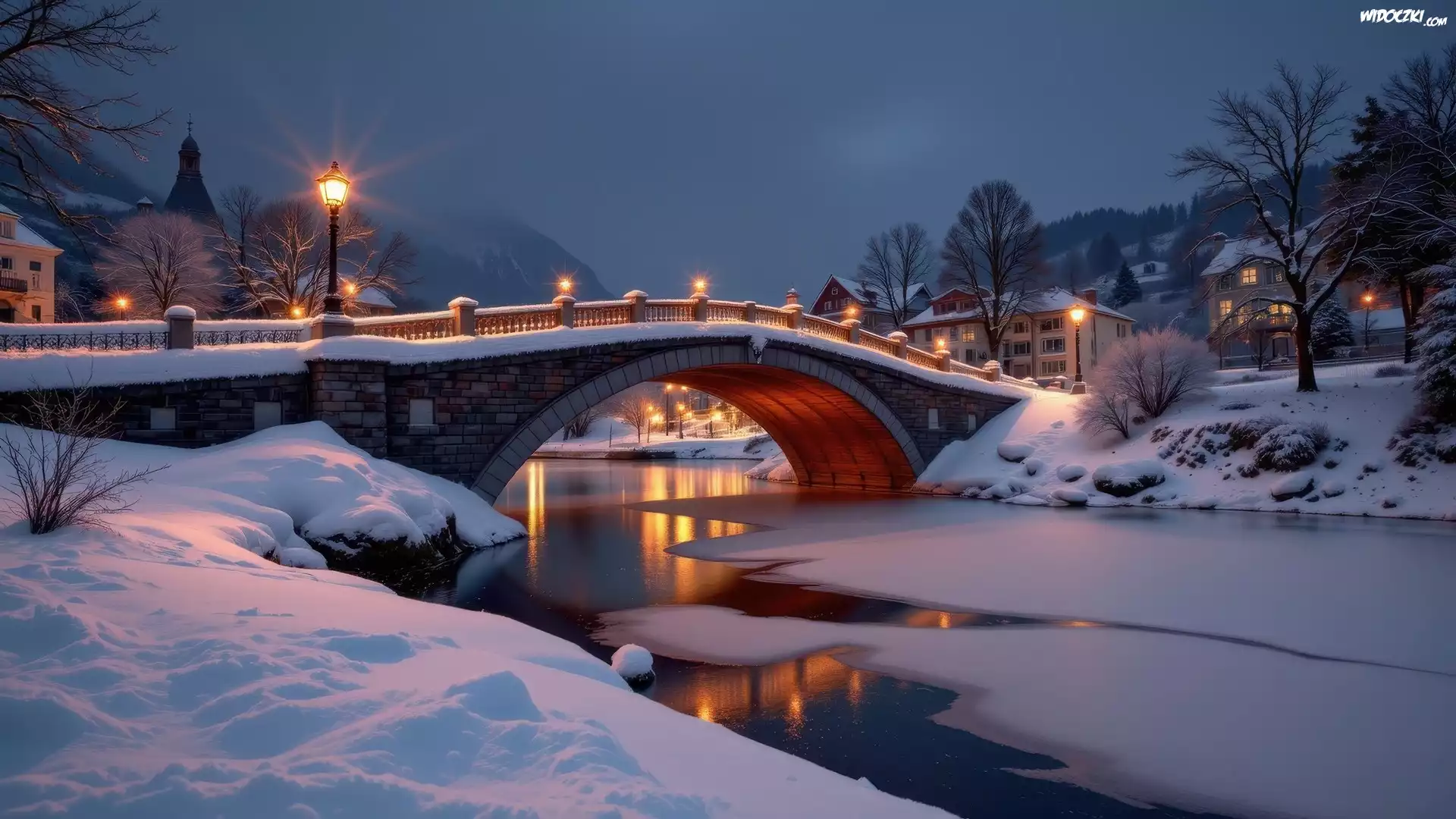 Zdjęcia, Zima, Noc, Most, Rzeka, Śnieg, Latarnie, Drzewa, Domy