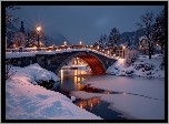 Zima, Noc, Most, Rzeka, Åšnieg, Latarnie, Drzewa, Domy