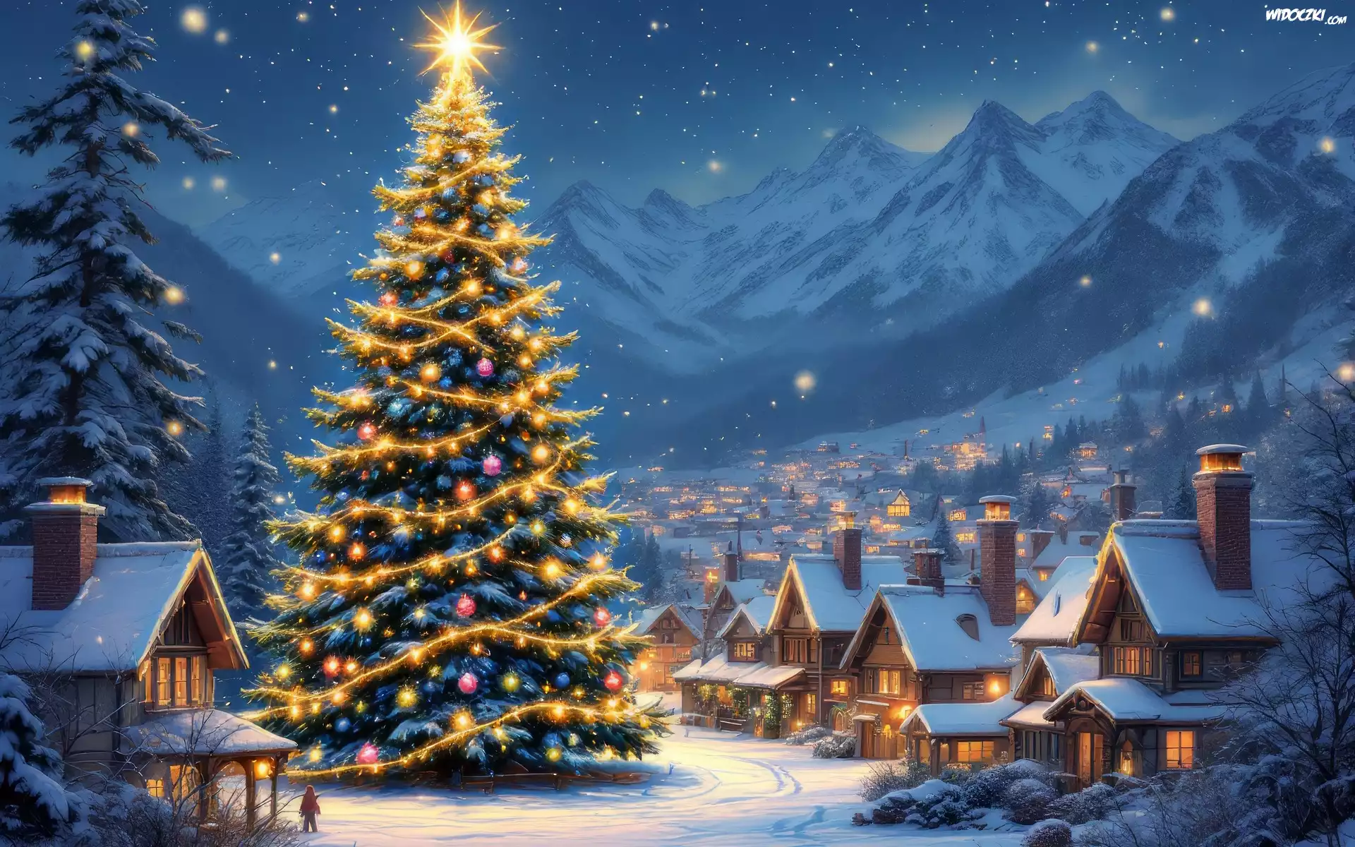 Zdjęcia, Grafika, Boże Narodzenie, Domy, Choinka, Góry, Zima
