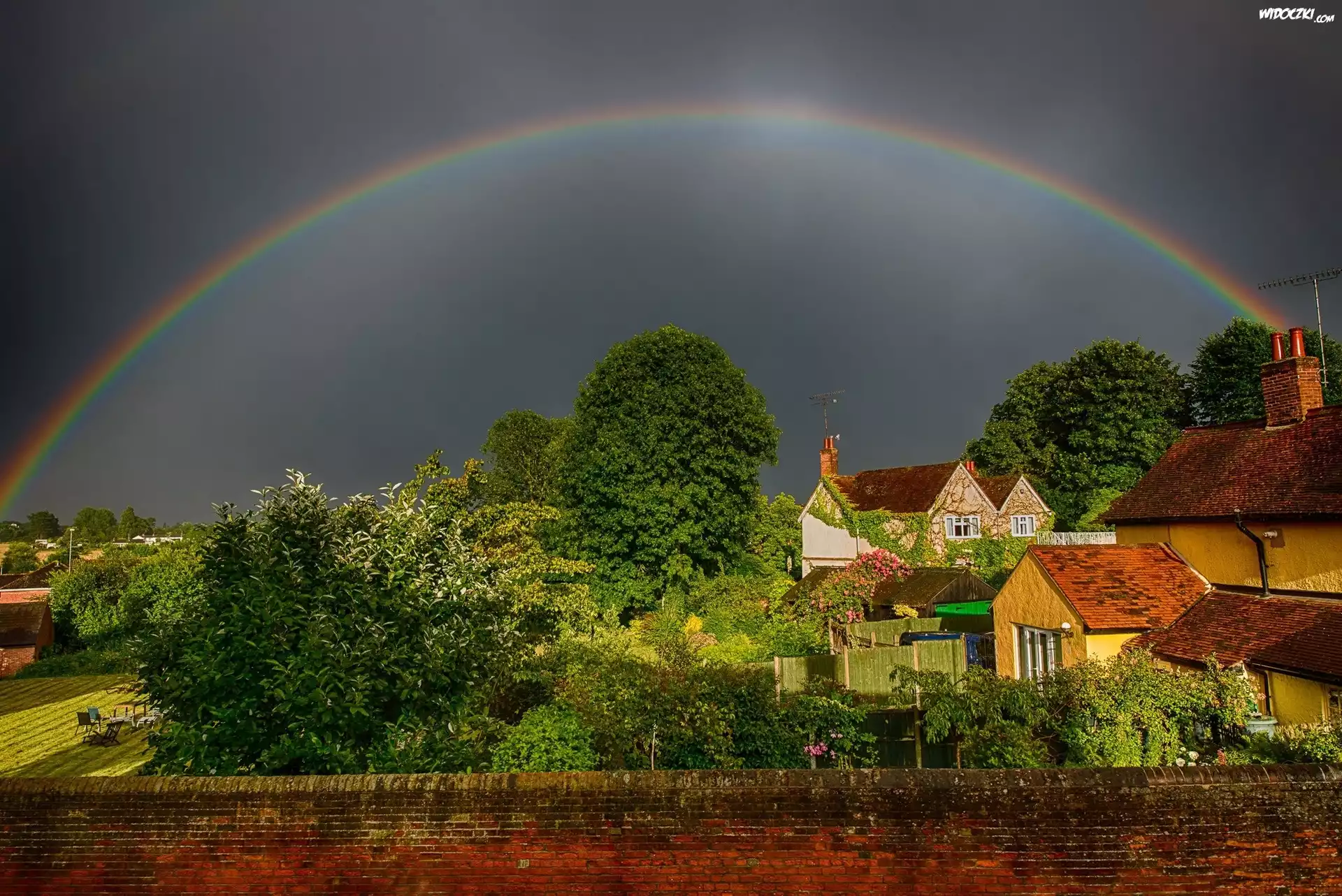 Domy, Ogrody, Pochmurne, Niebo, Tęcza
