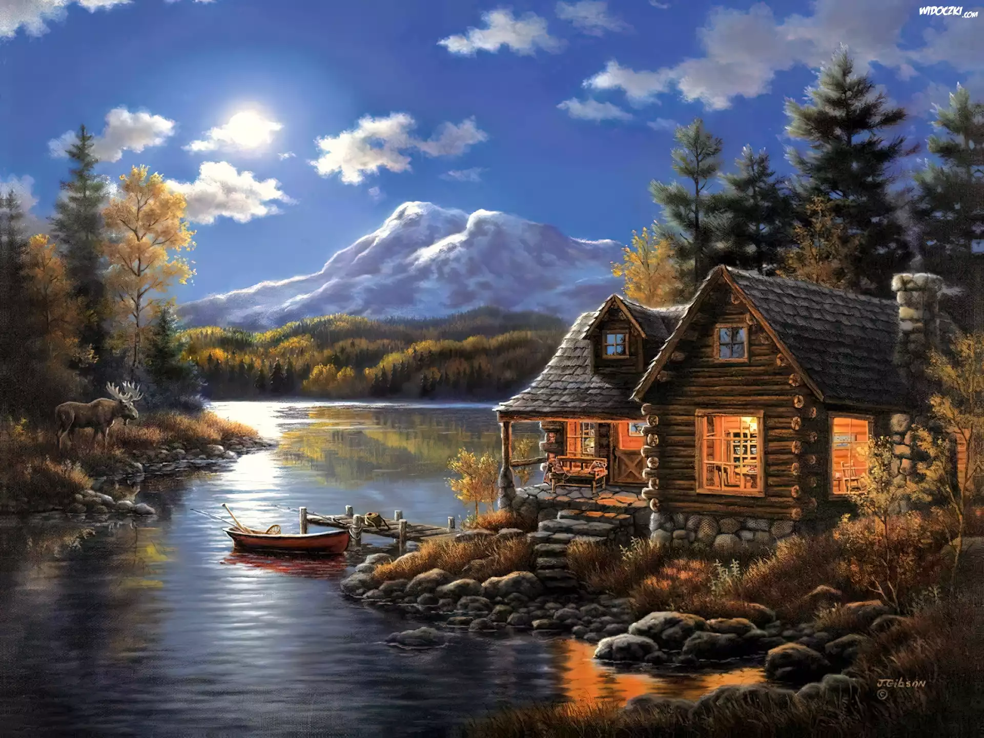 Zdjęcia, Domy, Góry, Jezioro, Łódka, Słońce