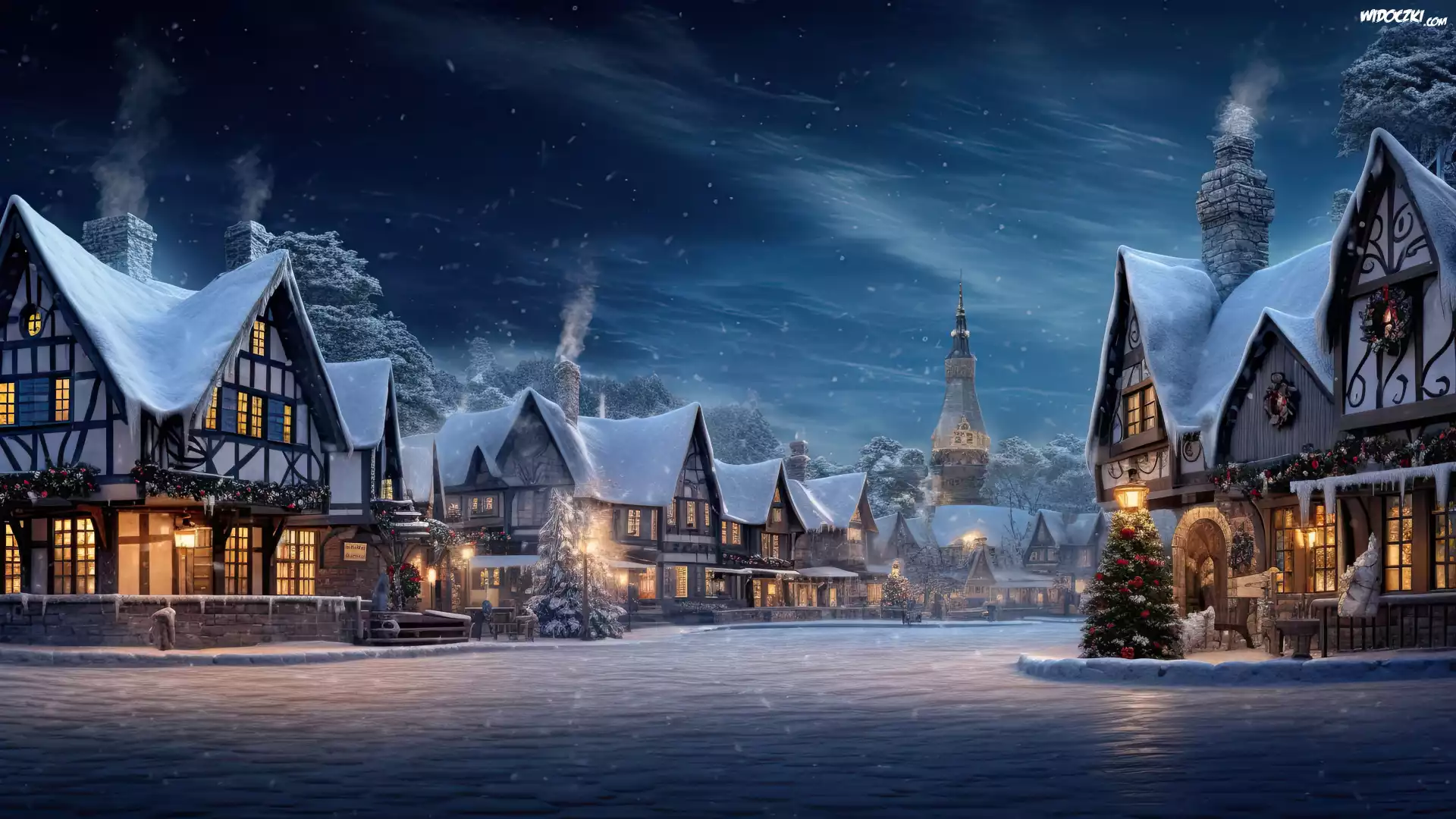 Zdjęcia, Zima, Domy, Oświetlone, Choinki, Grafika