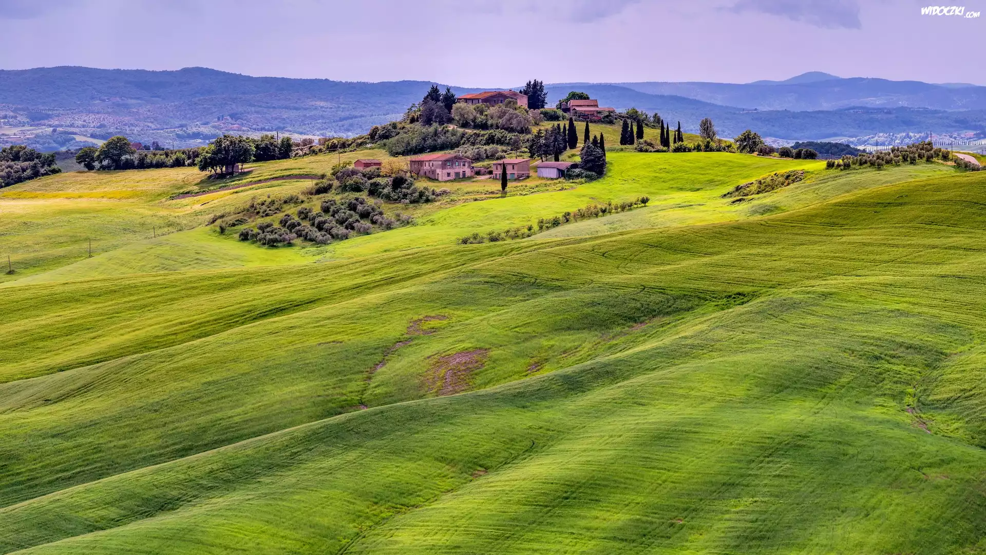 Zdjęcia, Włochy, Toskania, Wzgórze, Domy, Drzewa, Pola