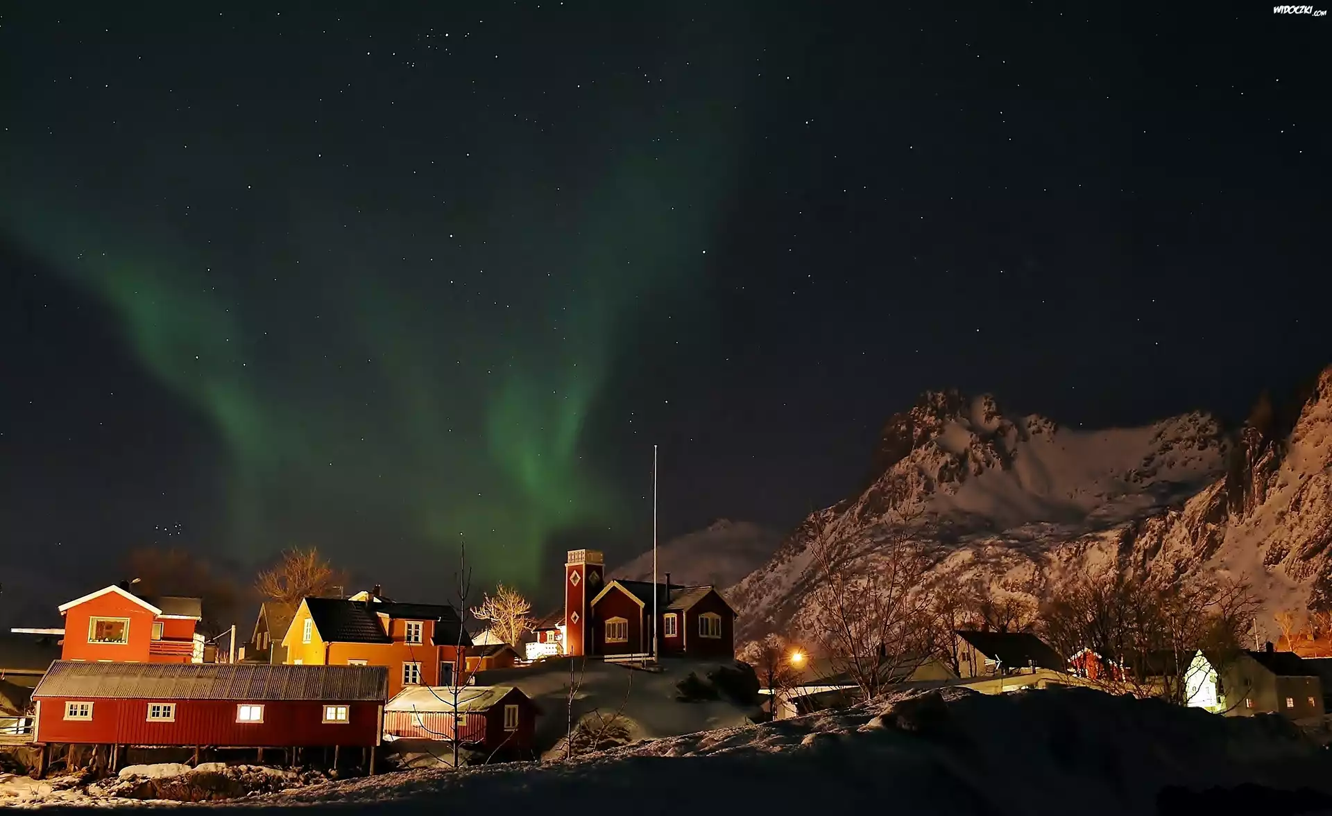Zdjęcia, Domy, Osada, Góry, Zorza, Polarna, Lofoty