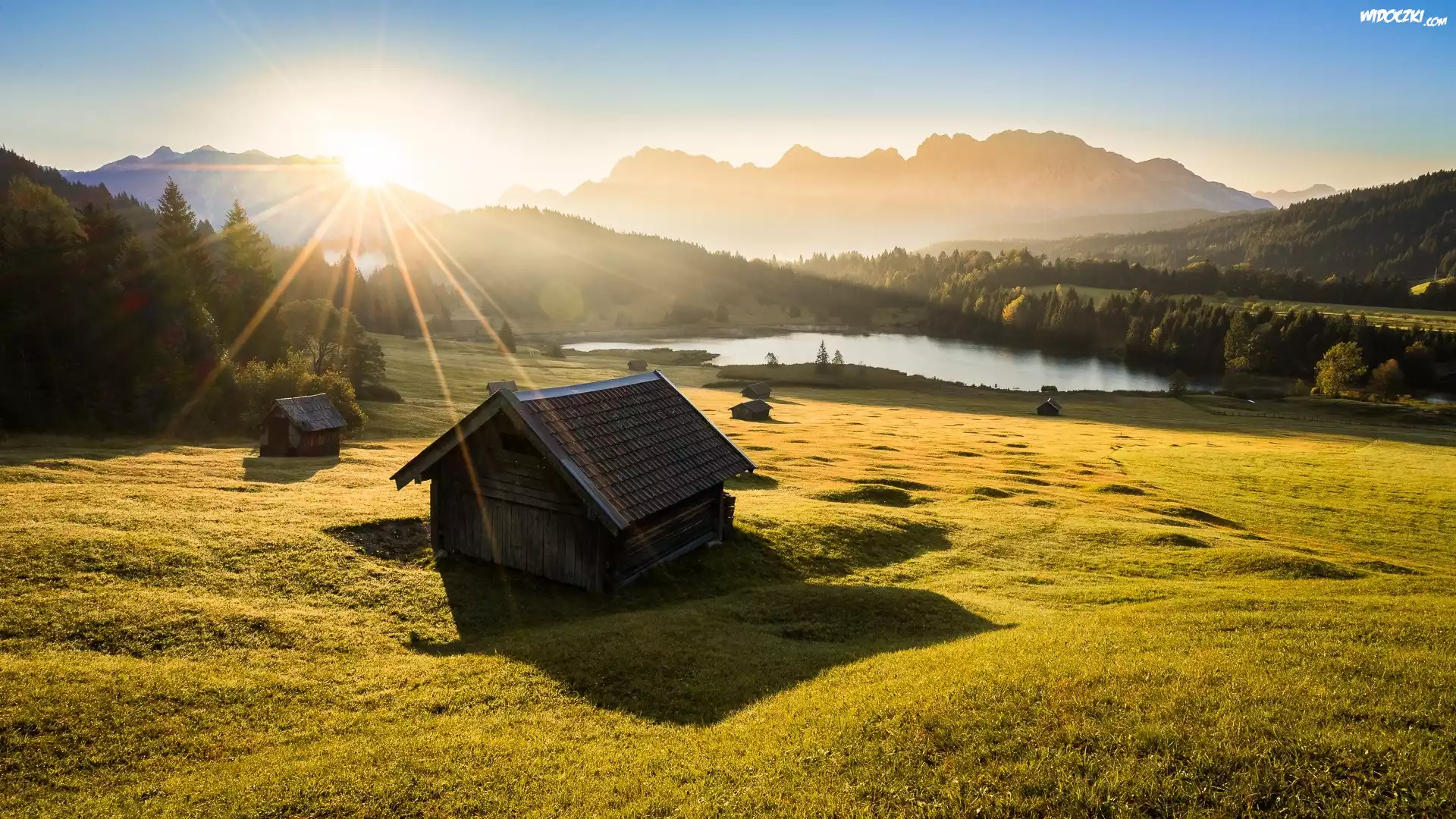 Niemcy, Bawaria, Promienie słońca, Góry, Jezioro Wagenbrüchsee, Domy