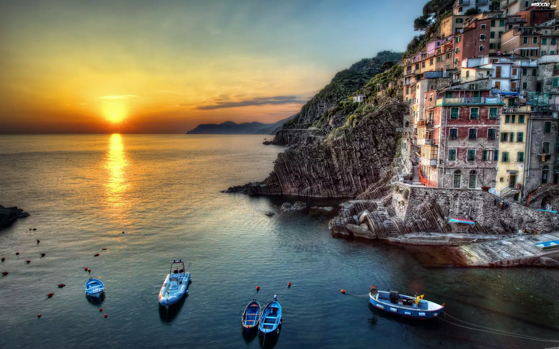 Zdjęcia, Domy, Morze, Łódki, Riomaggiore, Włochy