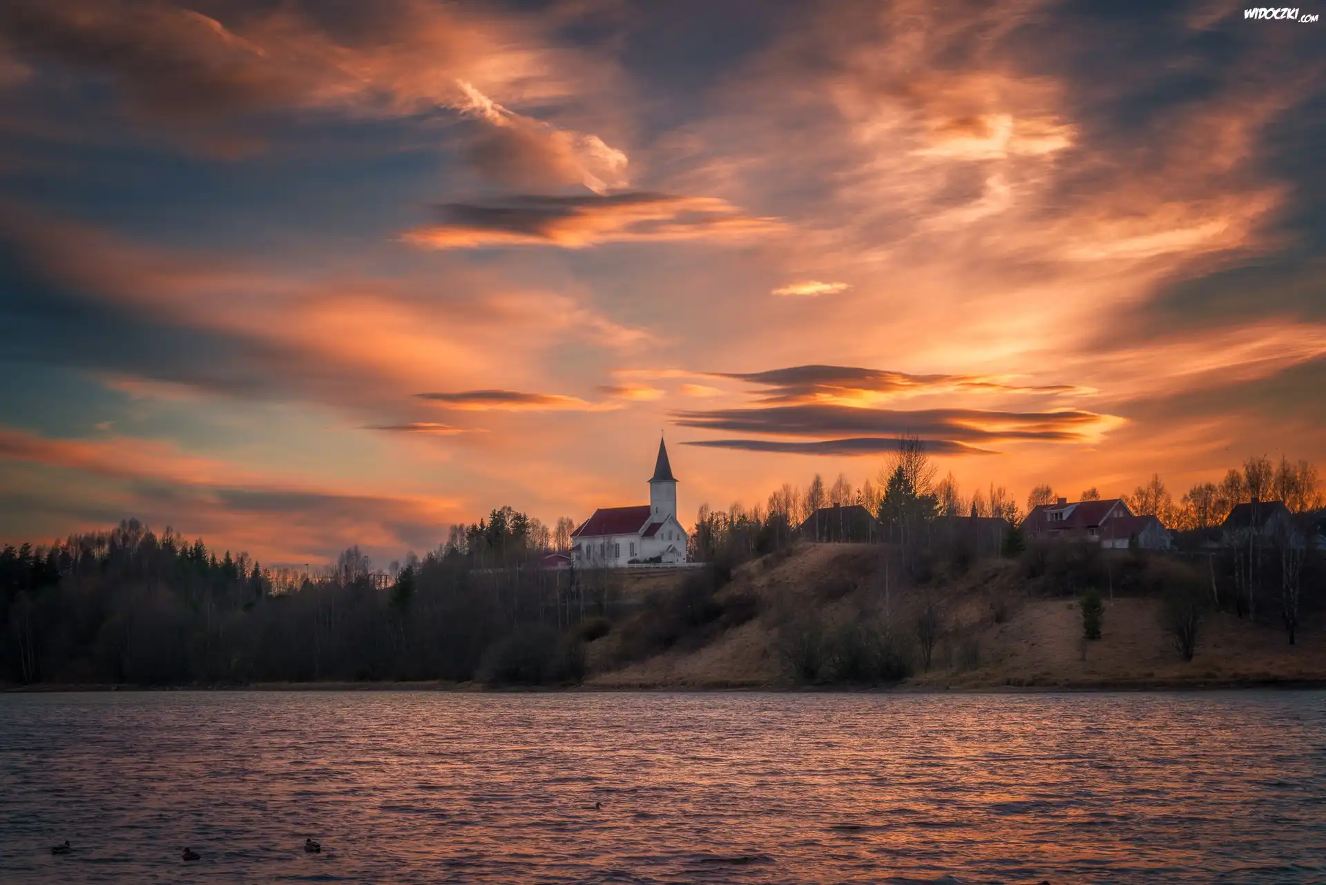 Zdjęcia, Rzeka, Domy, Kościół, Drzewa, Zachód słońca, Chmury