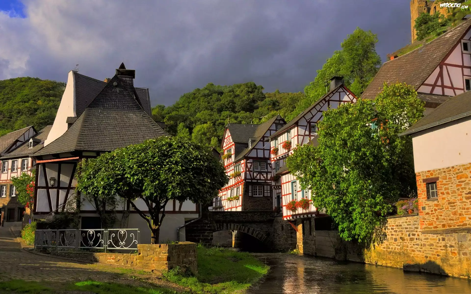 Zdj臋cia, Domy, Drzewa, Rzeka, Most