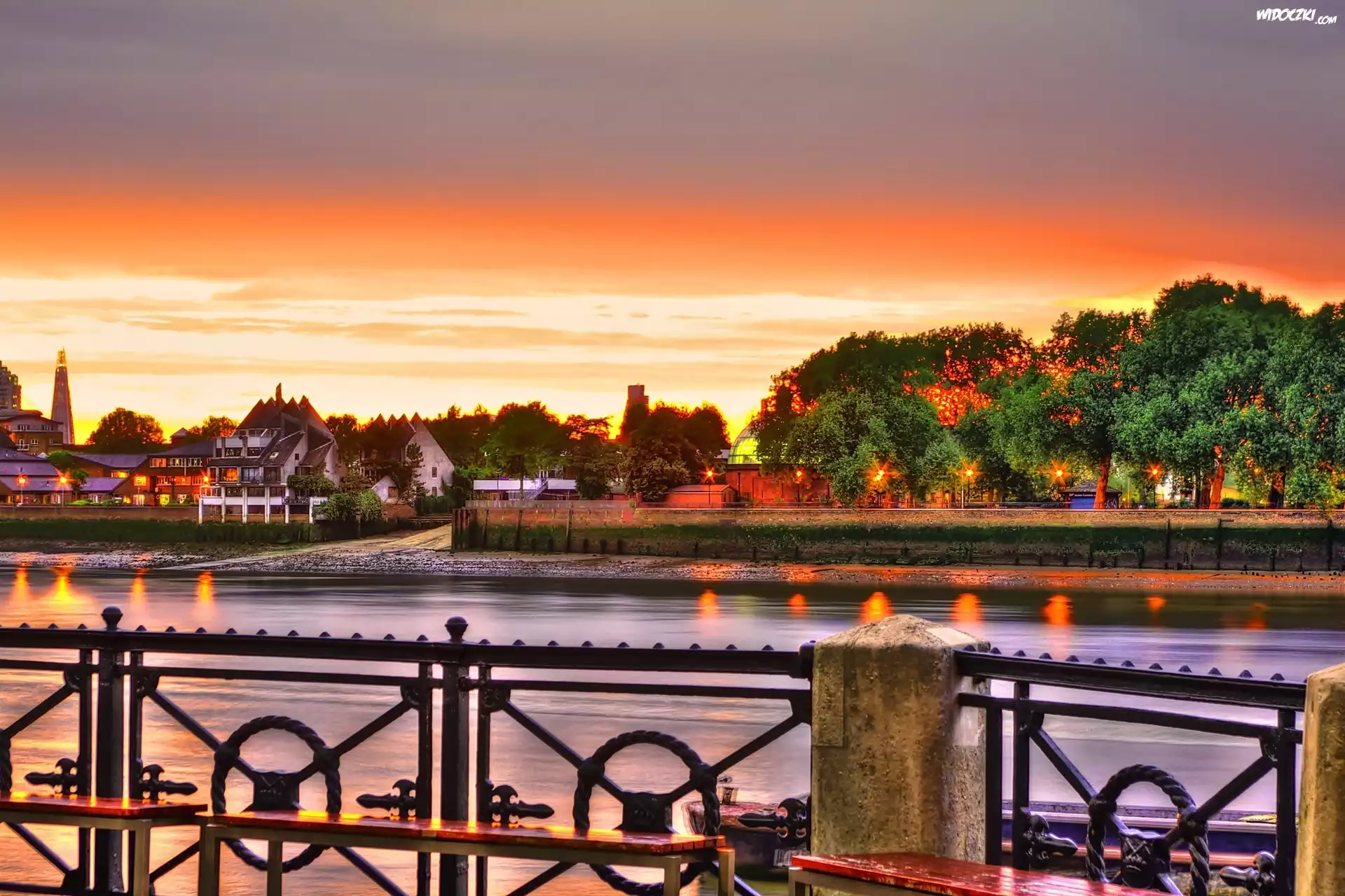 Rzeka, Domy, Zachód słońca, Balustrada Anglia, HDR