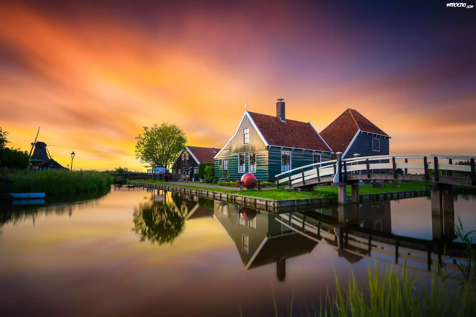 Holandia, Skansen Zaanse Schans, Rzeka, Most, Budynki, Zachód słońca, Domy