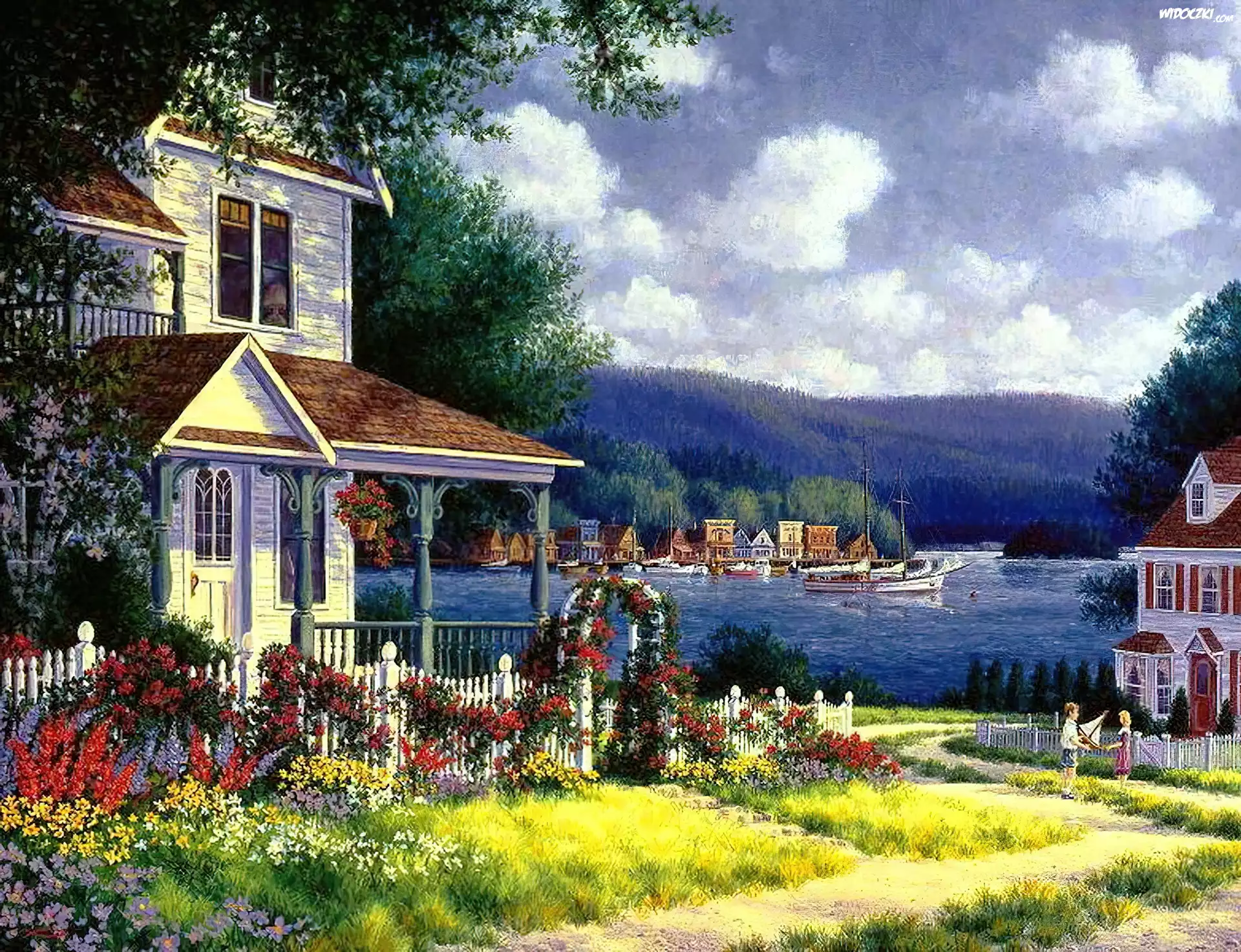 Domy, Jezioro, Bawiące, Się, Dzieci