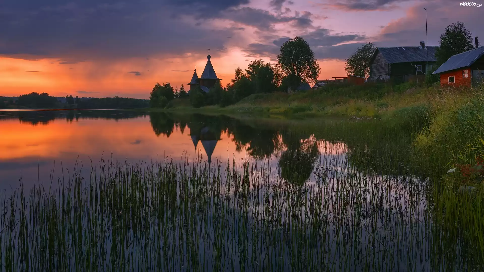Zdjęcia, Cerkiew, Jezioro, Szuwary, Domy, Zachód słońca