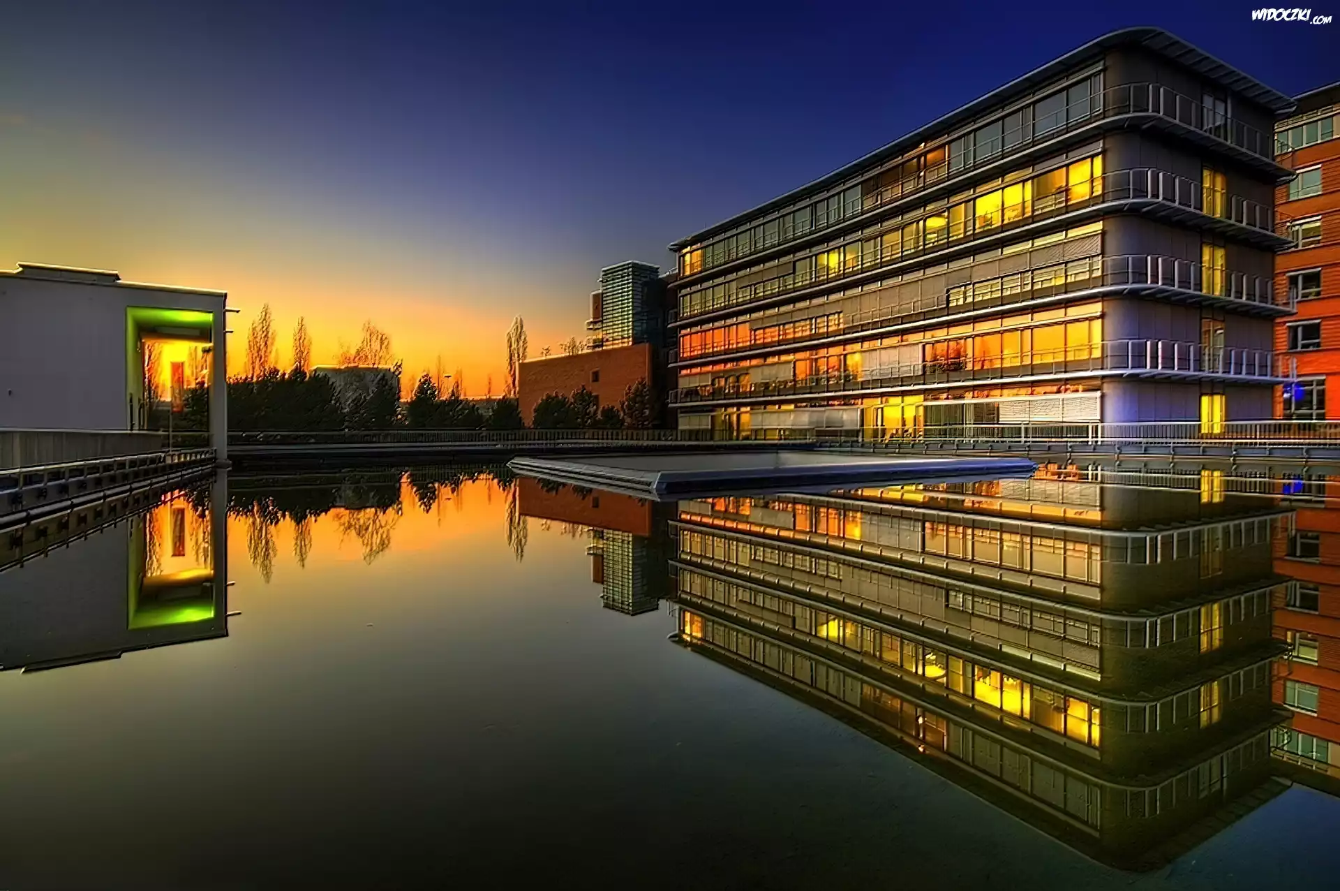 Zdjęcia, Domy, Zachód, Słońca, Rzeka
