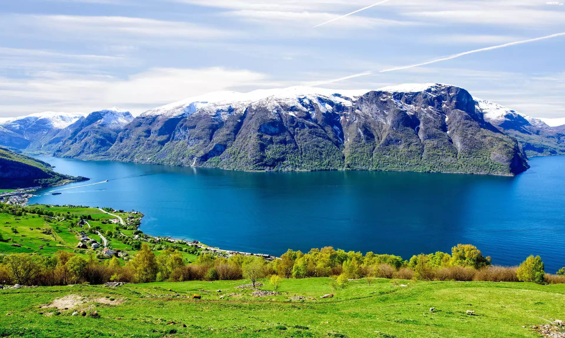 Zdjęcia, Norwegia, Fiord Aurlandsfjord, Hrabstwo Sogn og Fjordane, Góry, Krzewy, Domy
