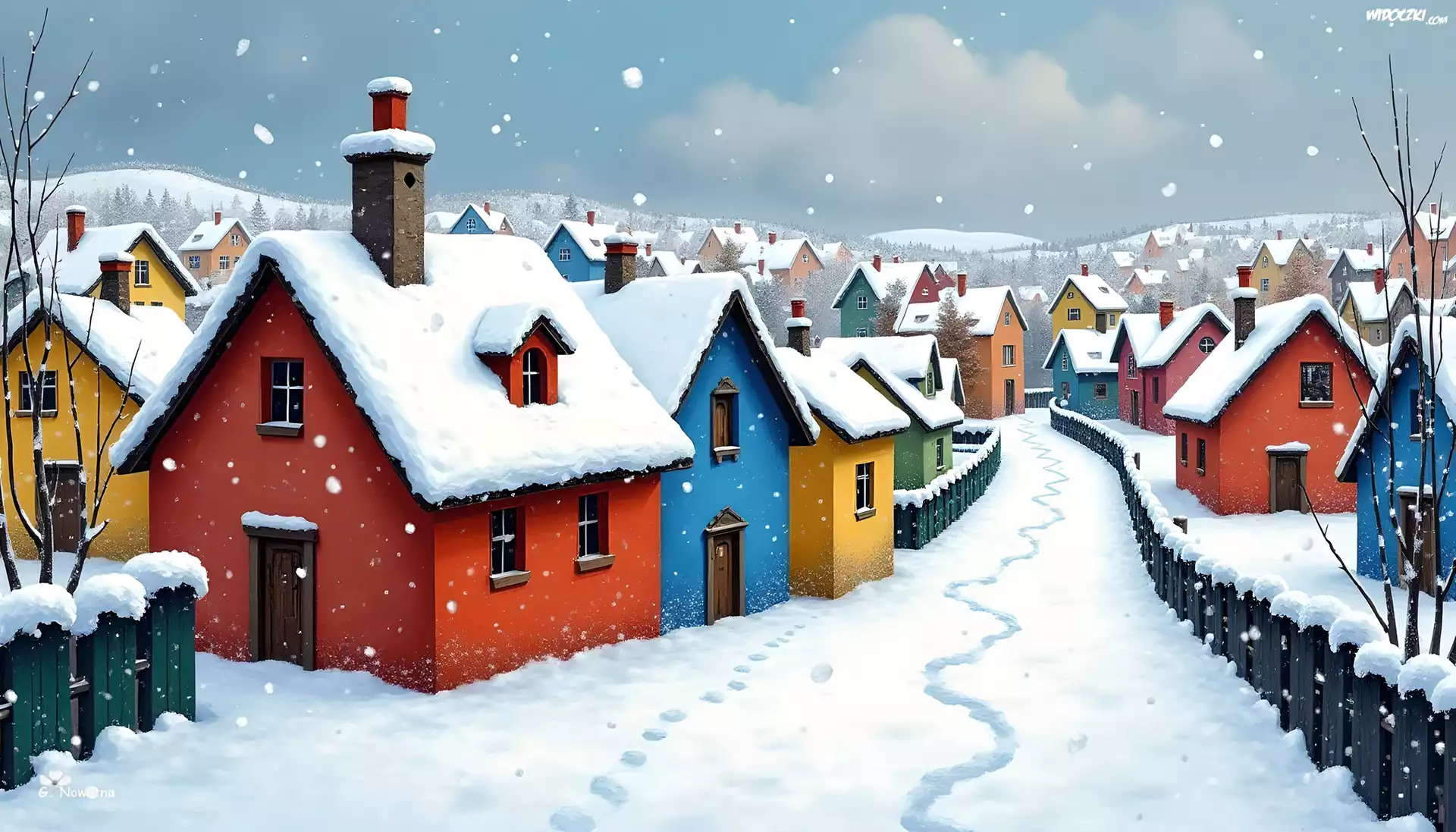 Kolorowe, Domy, Ulica, Zima, Grafika