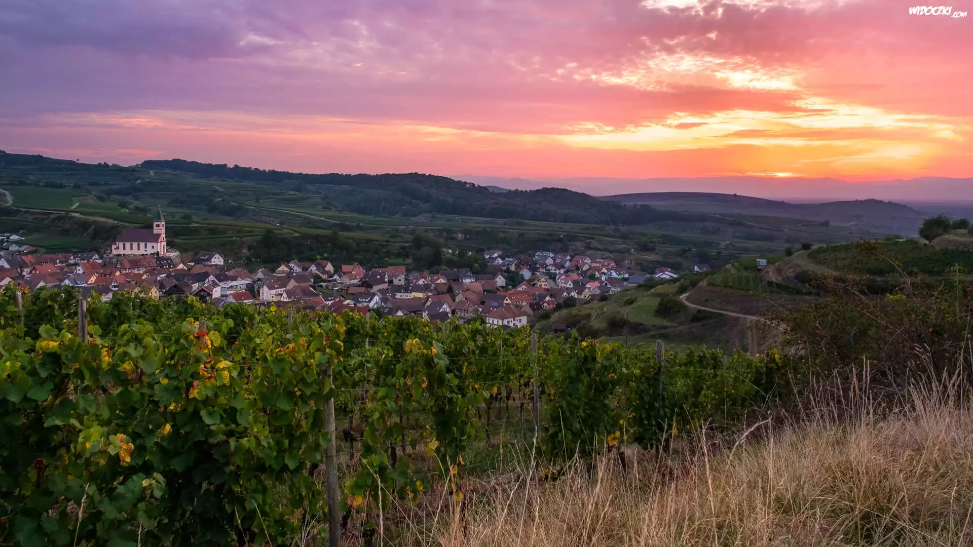 Wzgórza, Kaiserstuhl, Domy, Plantacja, Winnice, Zachód słońca, Bahlingen, Badenia-Wirtembergia, Niemcy |