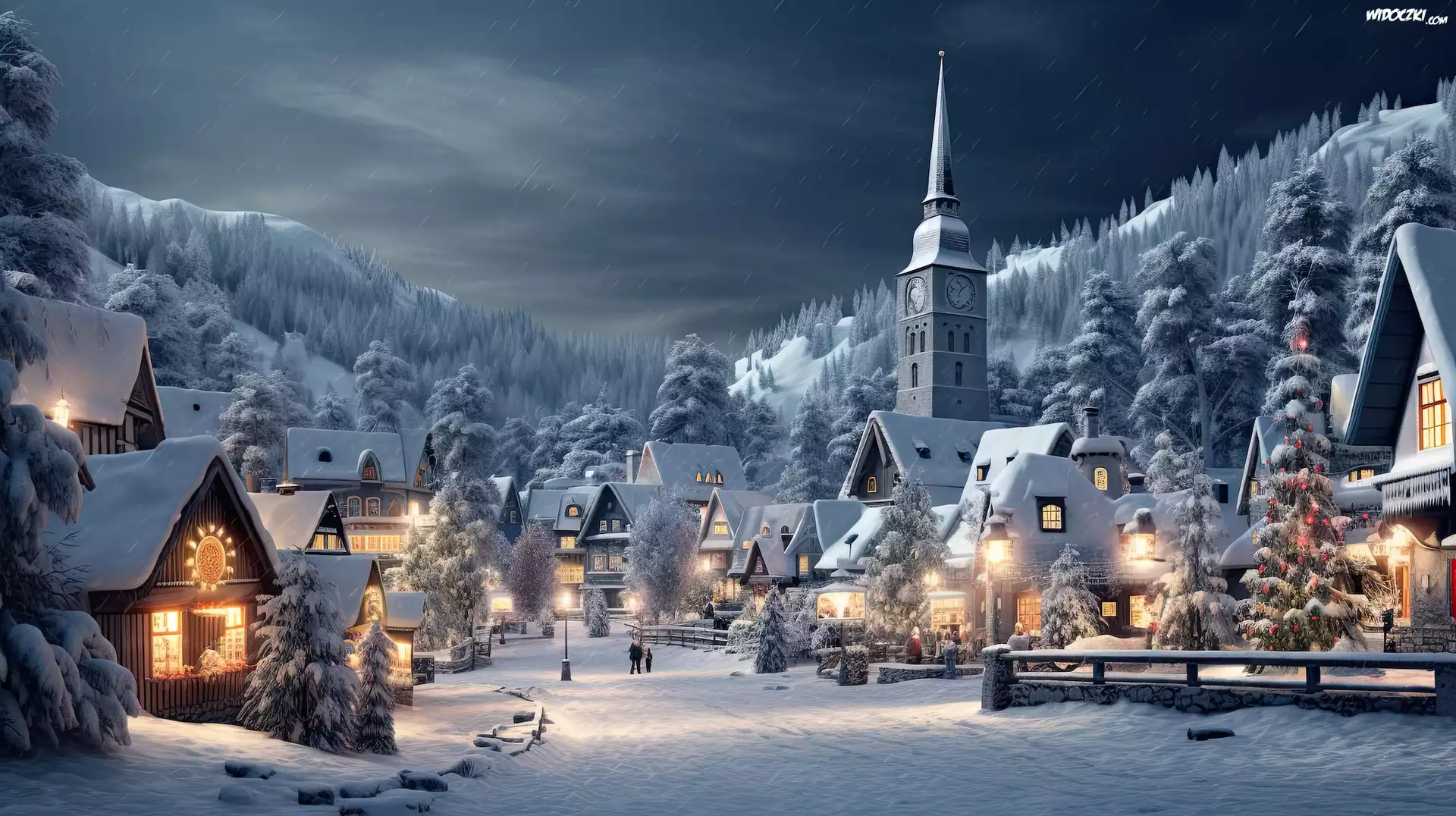Zdjęcia, Grafika, Zima, Wioska, Domy, Kościół, Choinki, Wieczór