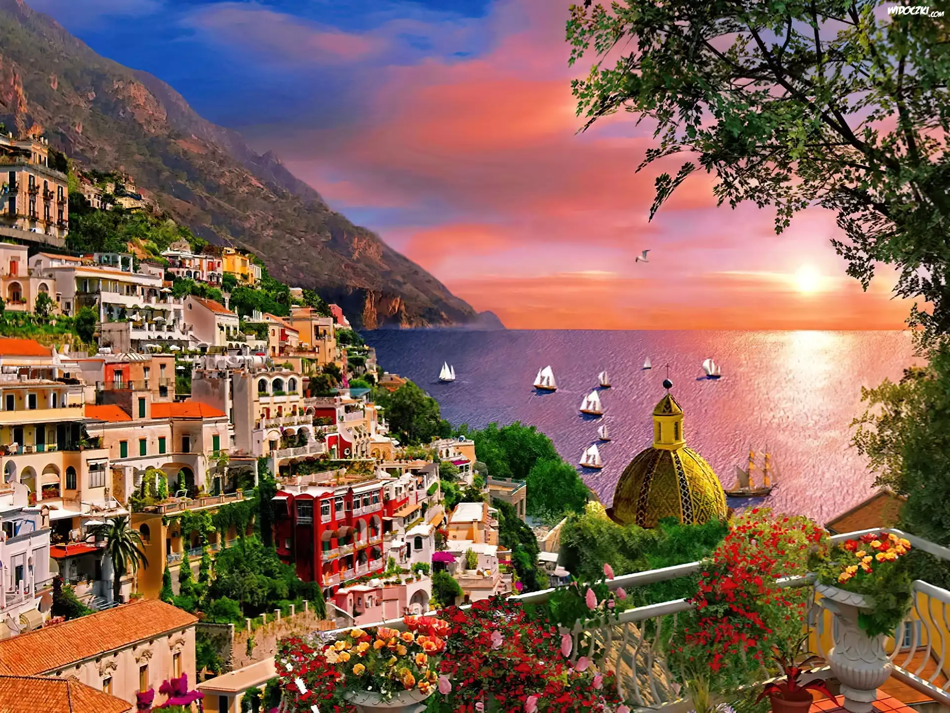 Zdjęcia, Domy, Morze, Góra, Zachód, Słońca