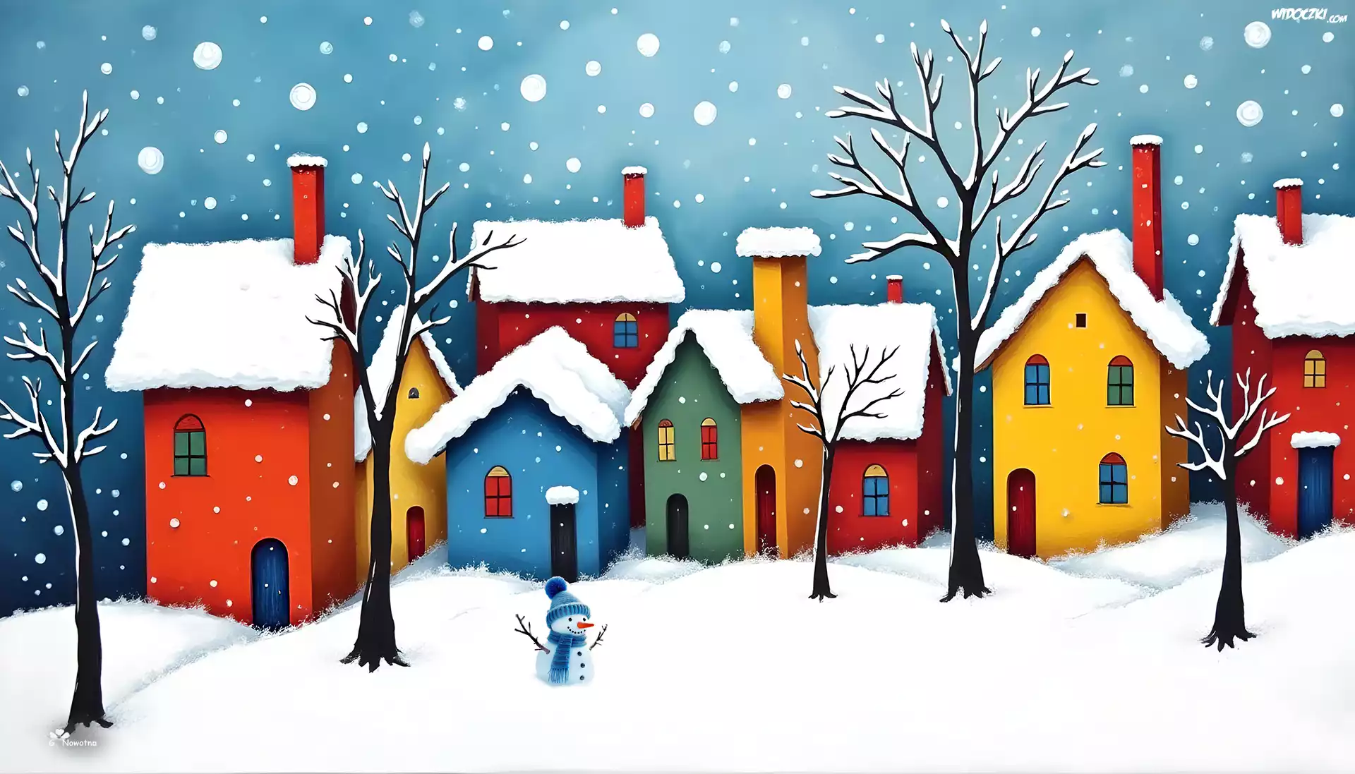 Zdjęcia, Kolorowe, Domy, Zima, Bałwan, Grafika