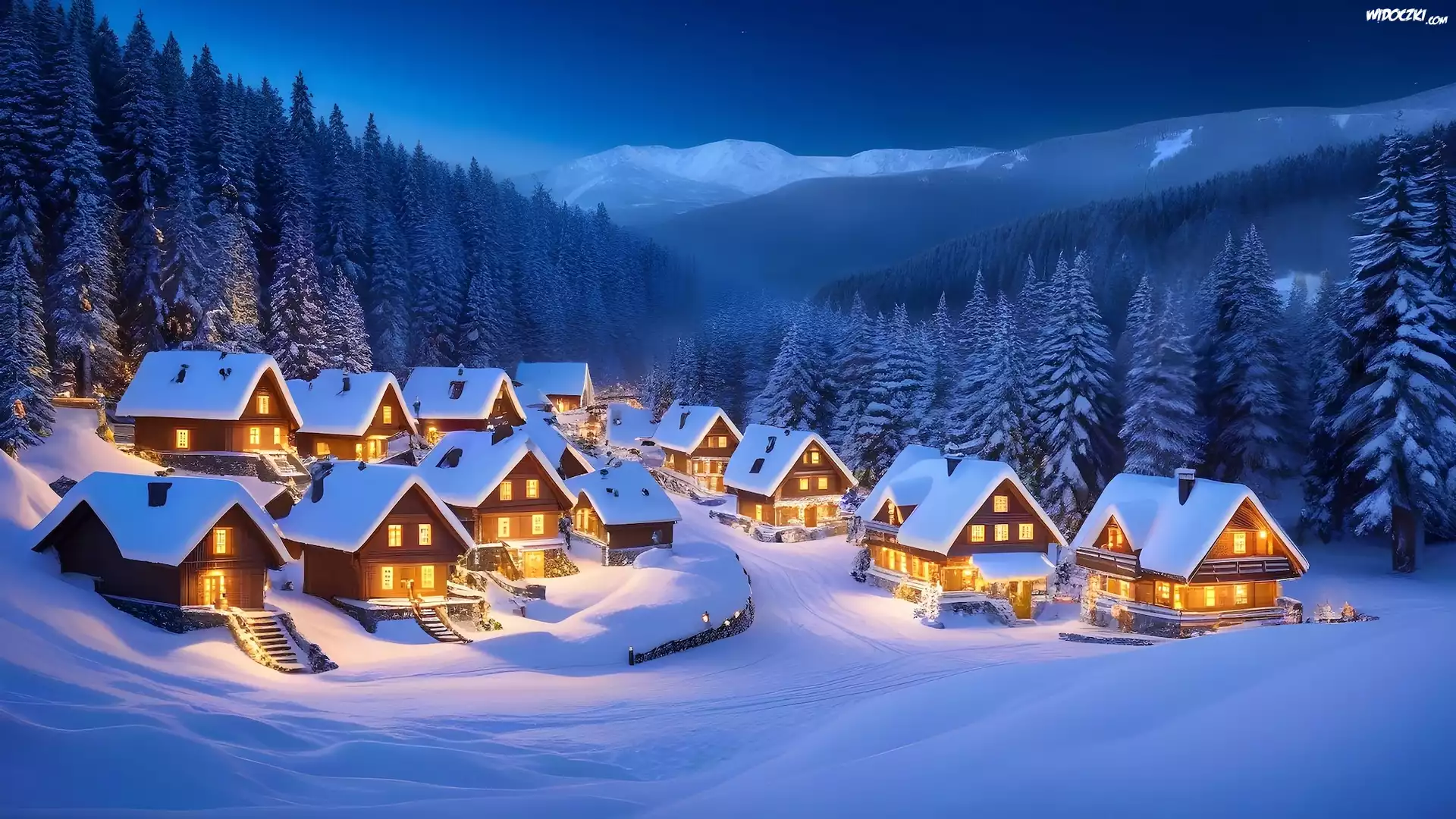 Zdjęcia, Góry, Las, Zima, Domy, Oświetlone, Śnieg, Grafika