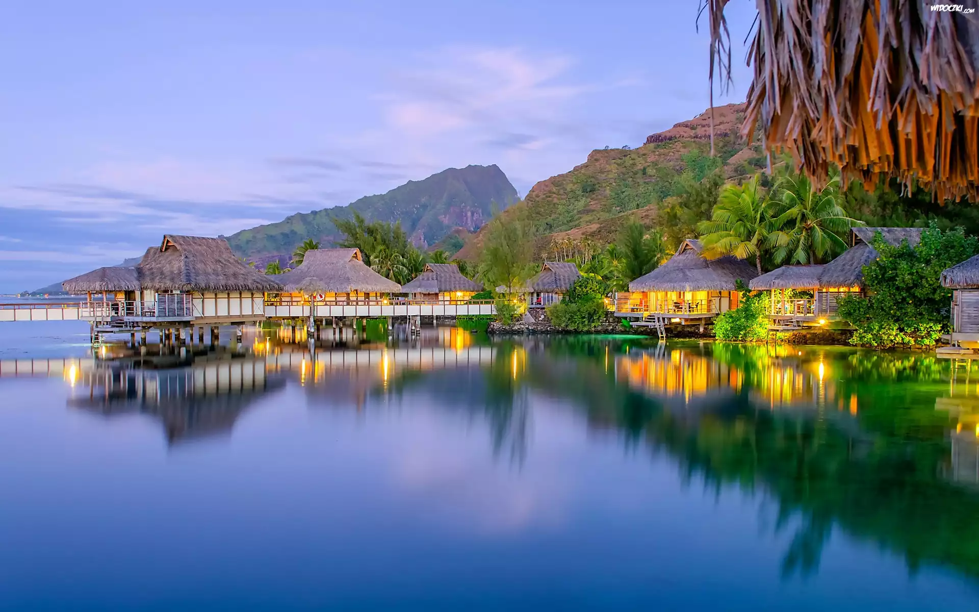 Zdjęcia, Domy, Palmy, Góry, Morze, Zmrok, Tropiki