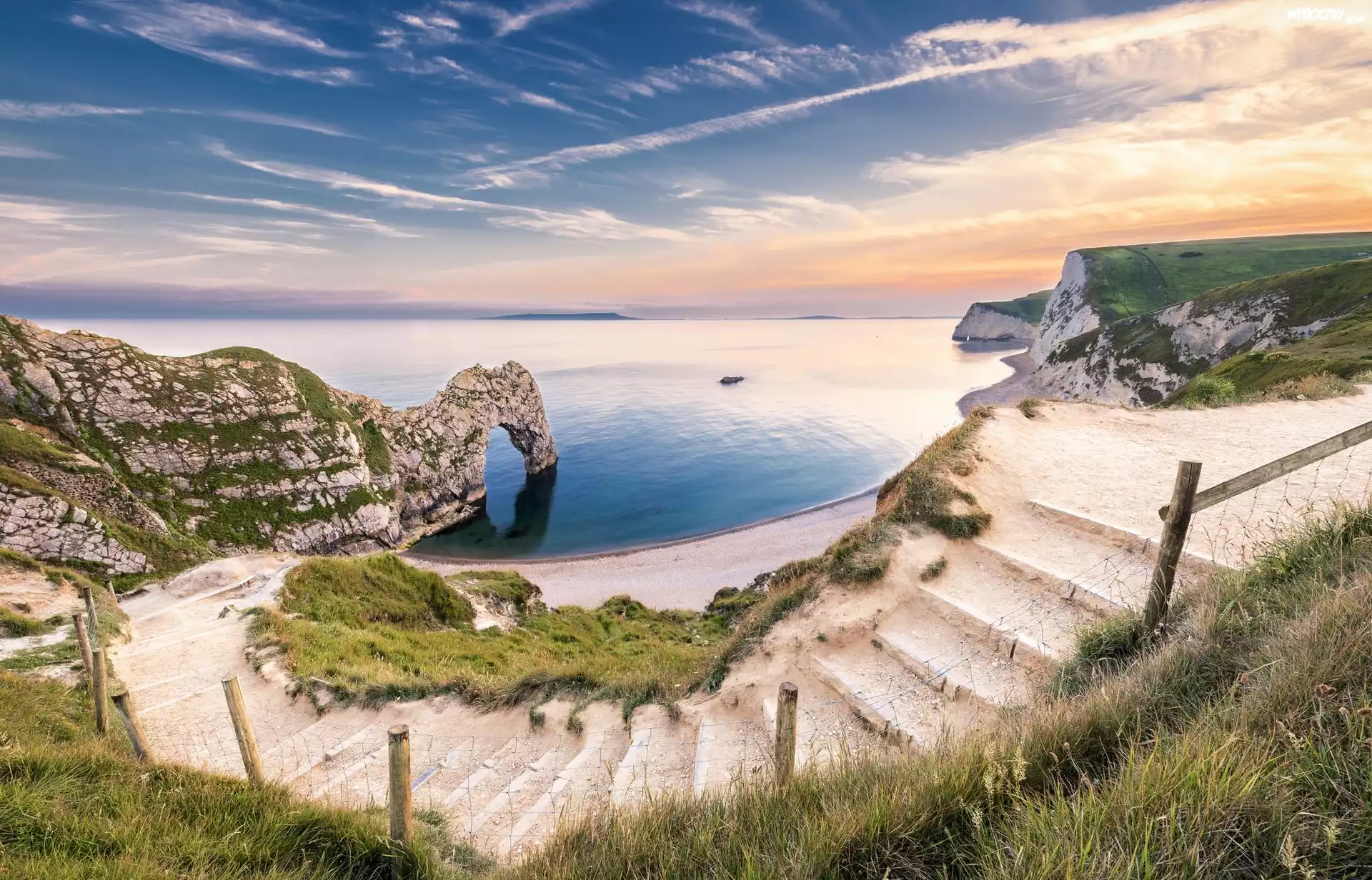 Zdjęcia, Łuk wapienny, Durdle Door, Morze, Skały, Wybrzeże Jurajskie, Schody, Wschód słońca, Plaża, Anglia