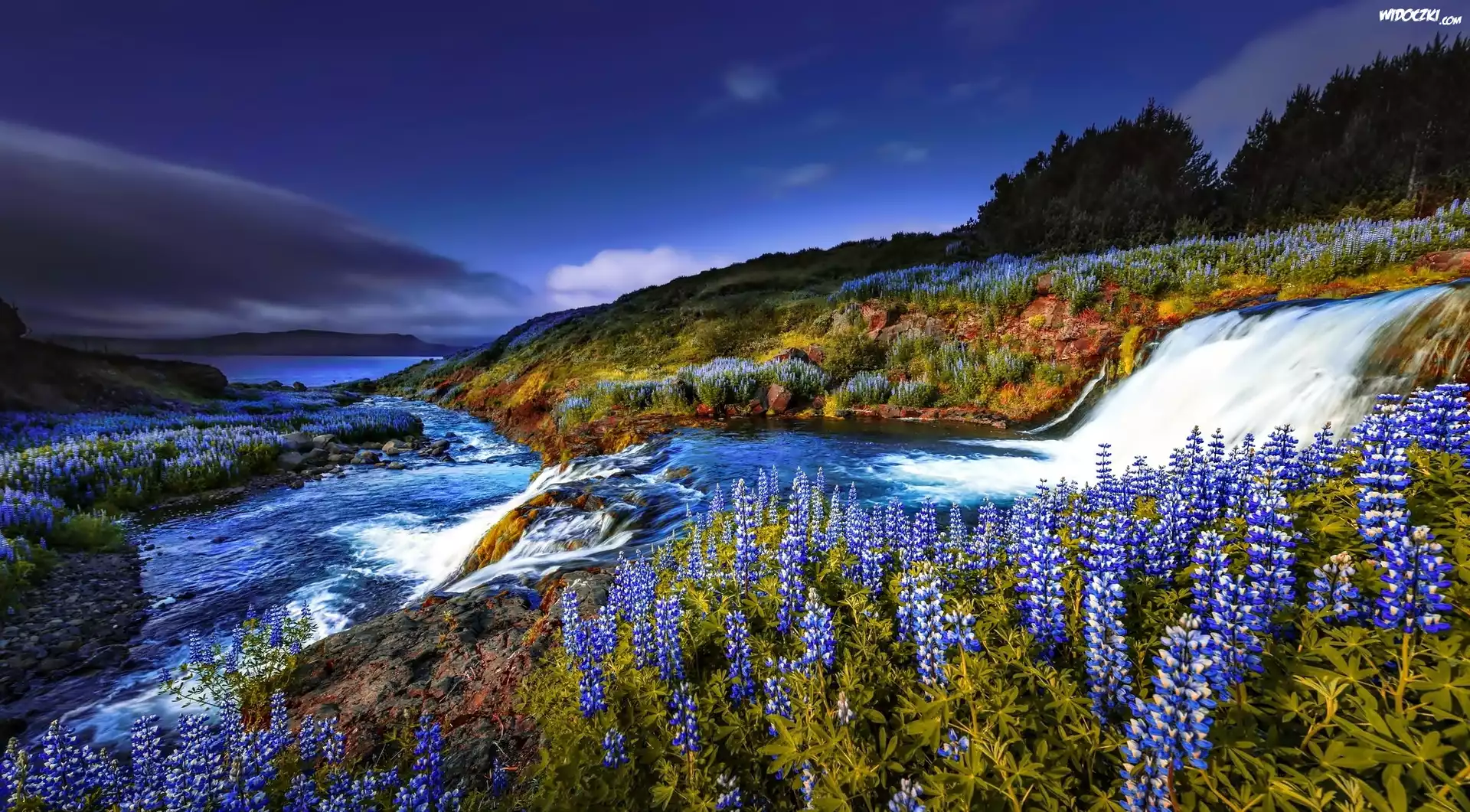 Rzeka, Dopływ, Jeziora, Wzgórza, Drzewa, Kwiaty, Łubin
