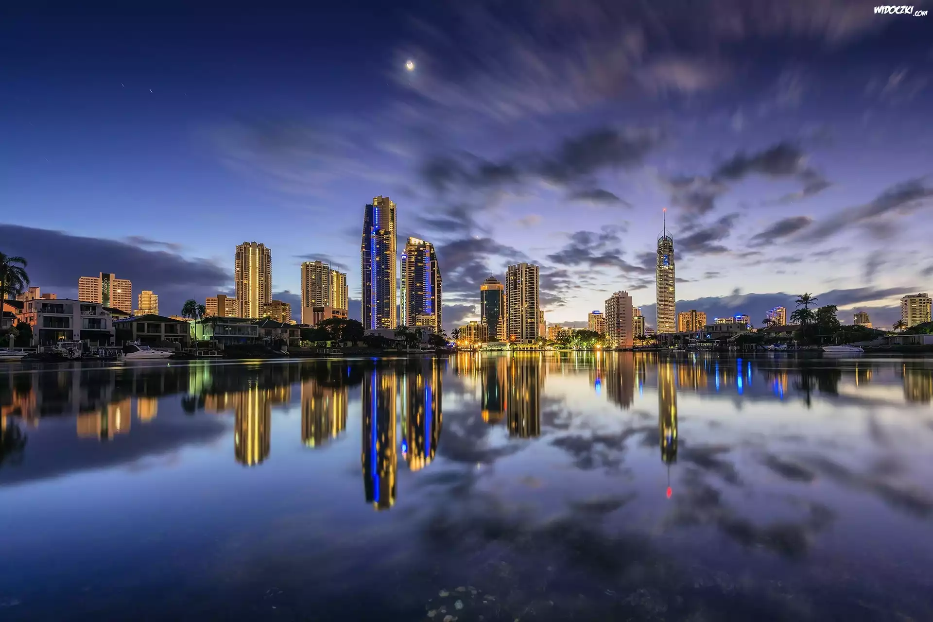 Drapacze Chmur, Niebo, Rzeka, Miasto noca