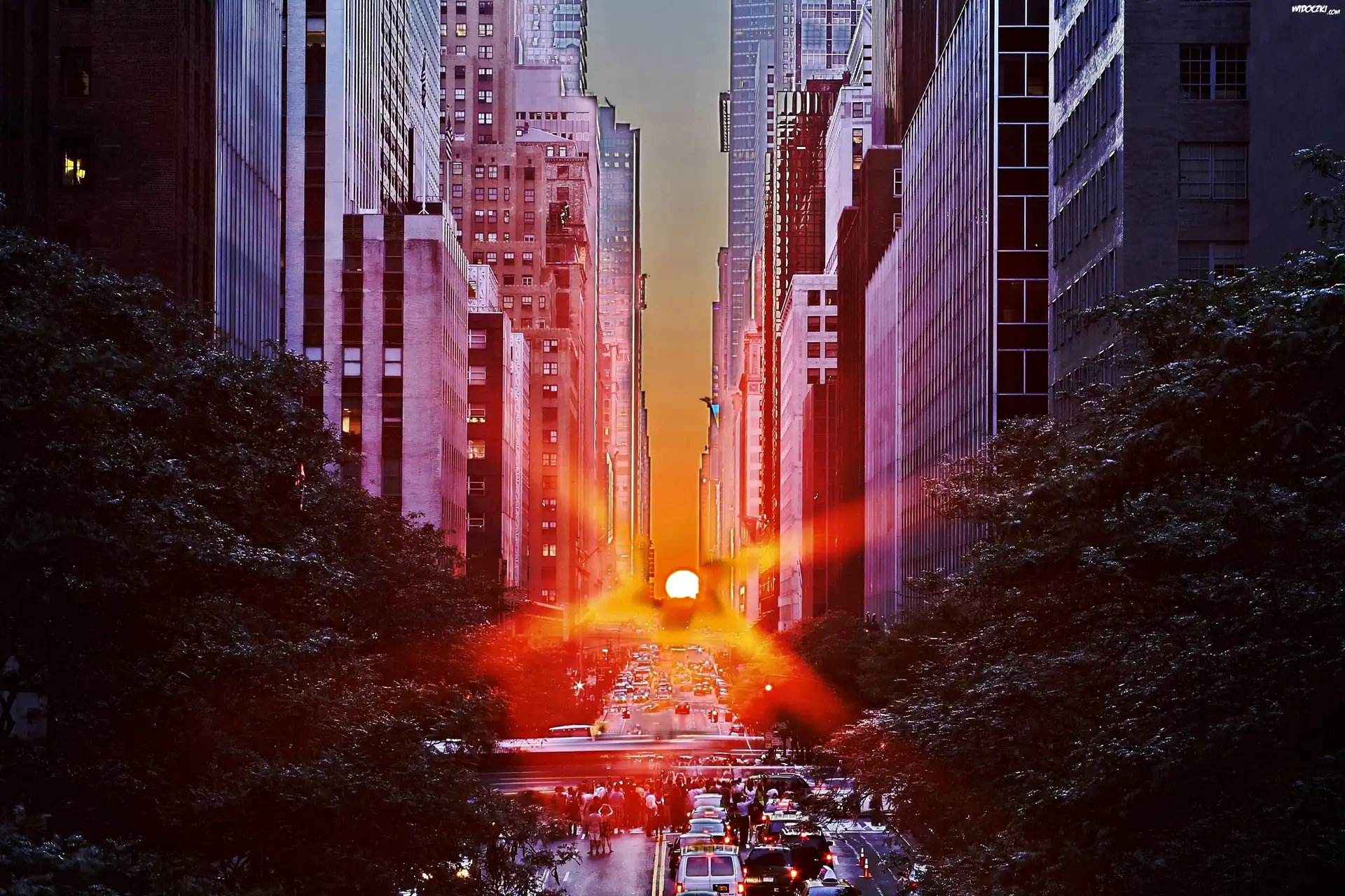 Drapacze, Chmur, Manhattan, Zachód, Słońca, Promienie
