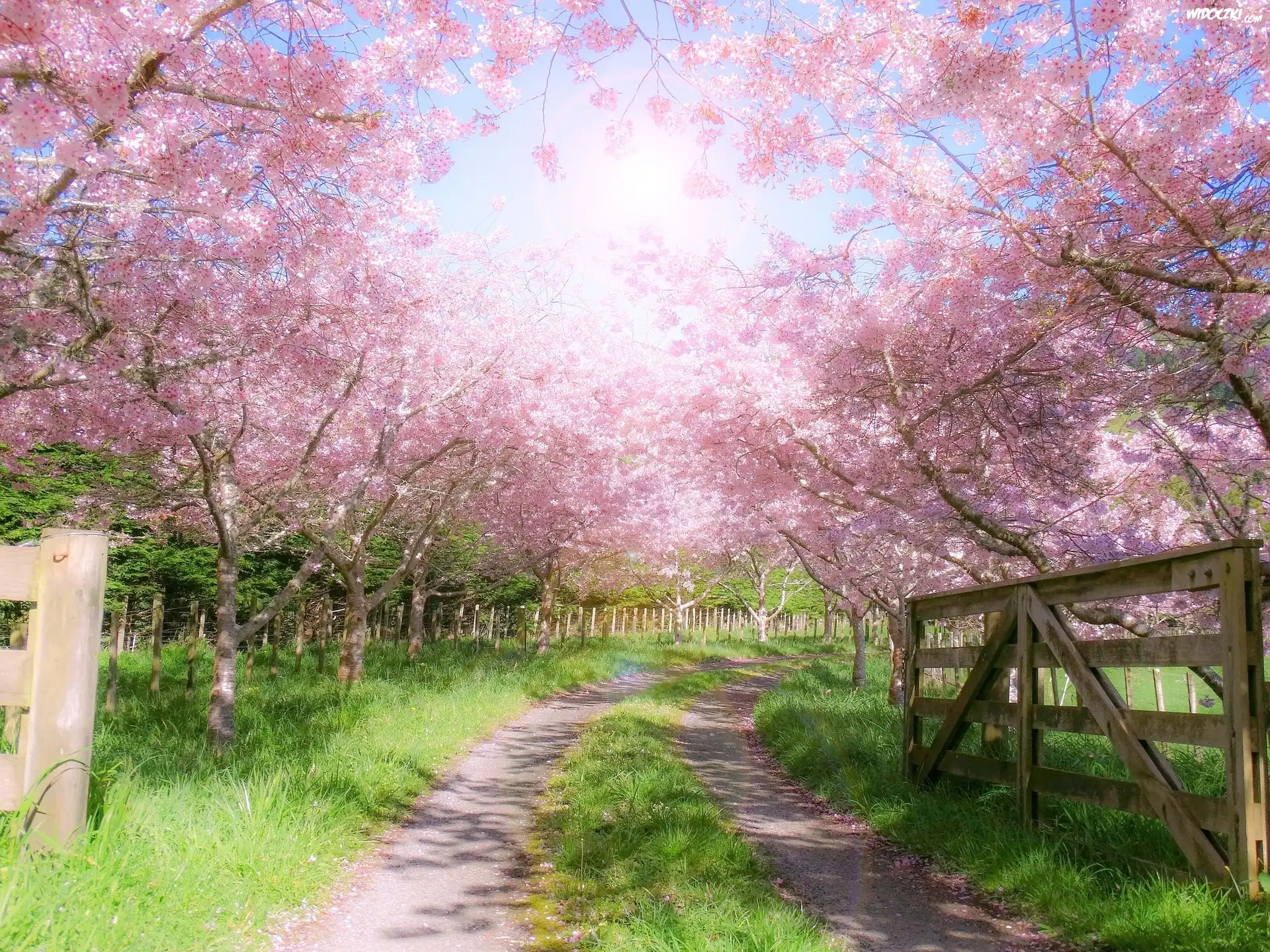 Zdjęcia, Farma, Drewniana, Brama, Droga, Kwitnące, Drzewa, Owocowe