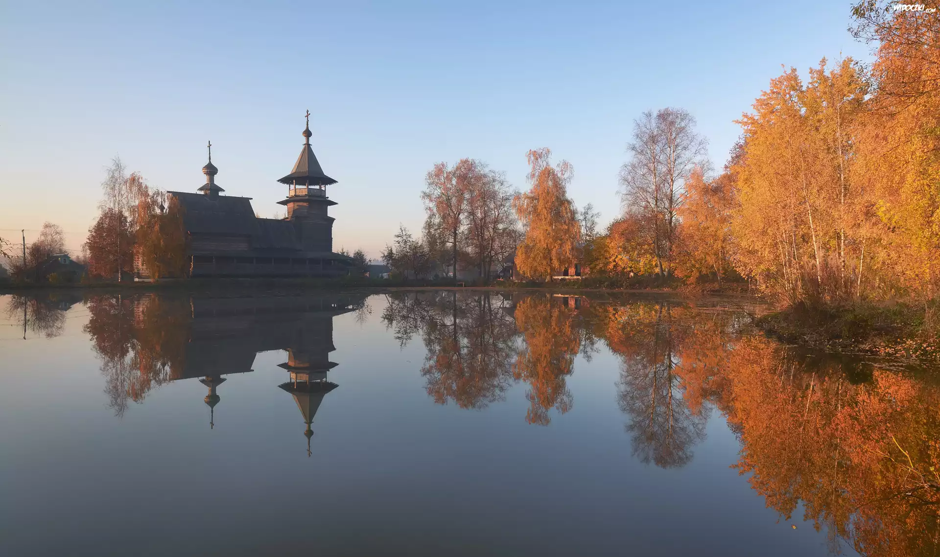 Zdjęcia, Jesień, Drzewa, Drewniana, Kaplica, Trawy, Jezioro Onega, Wyspa Kiży, Karelia, Rosja