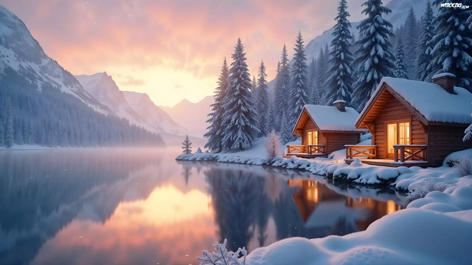 Góry, Jezioro, Drzewa, Drewniane, Domy, Ośnieżone, Zima