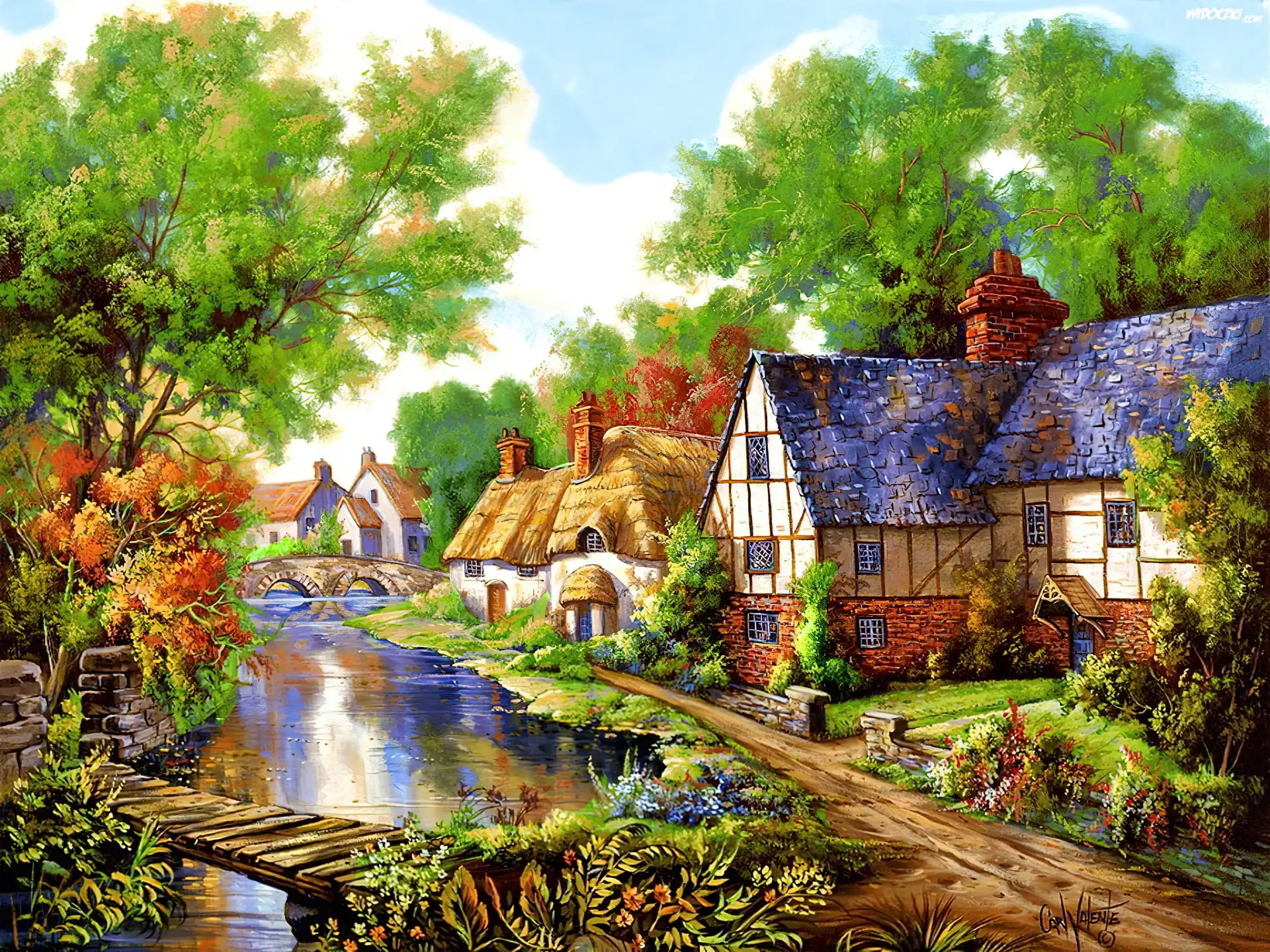 Drewniany, Mostek, Rzeka, Domy, Dróżka
