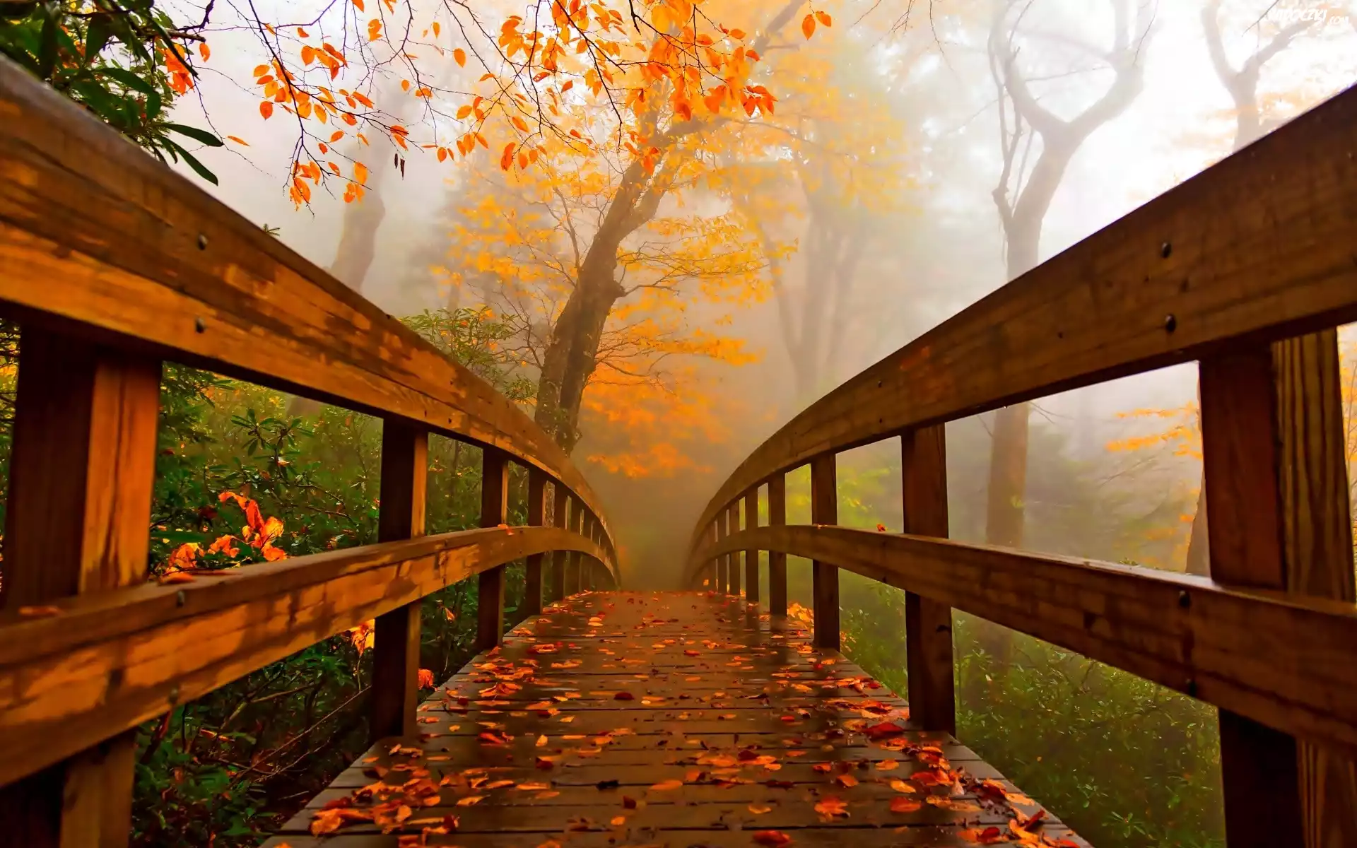 Zdjęcia, Drewniany, Most, Jesień, Park, Drzewa, Mgła