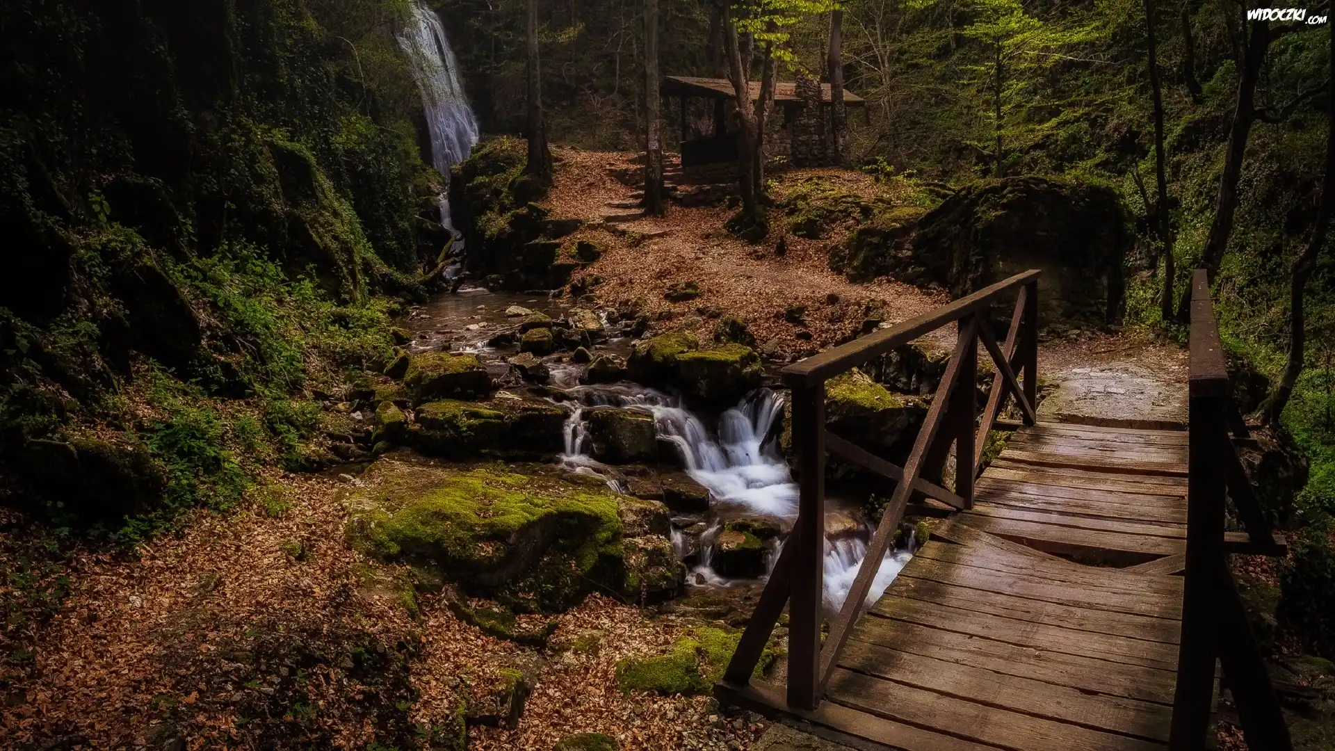 Zdjęcia, Drewniany, Most, Rzeczka, Kamienie, Las, Altanka