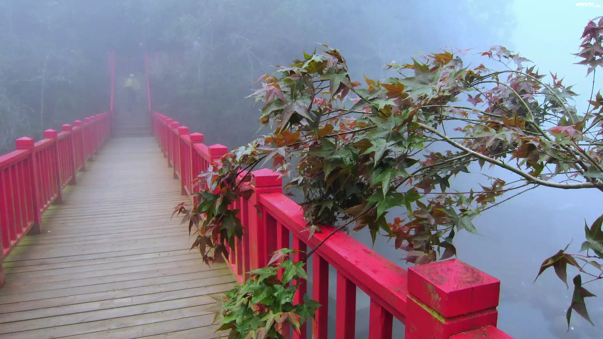 Zdjęcia, Drewniany, Most, Mgła, Drzewa