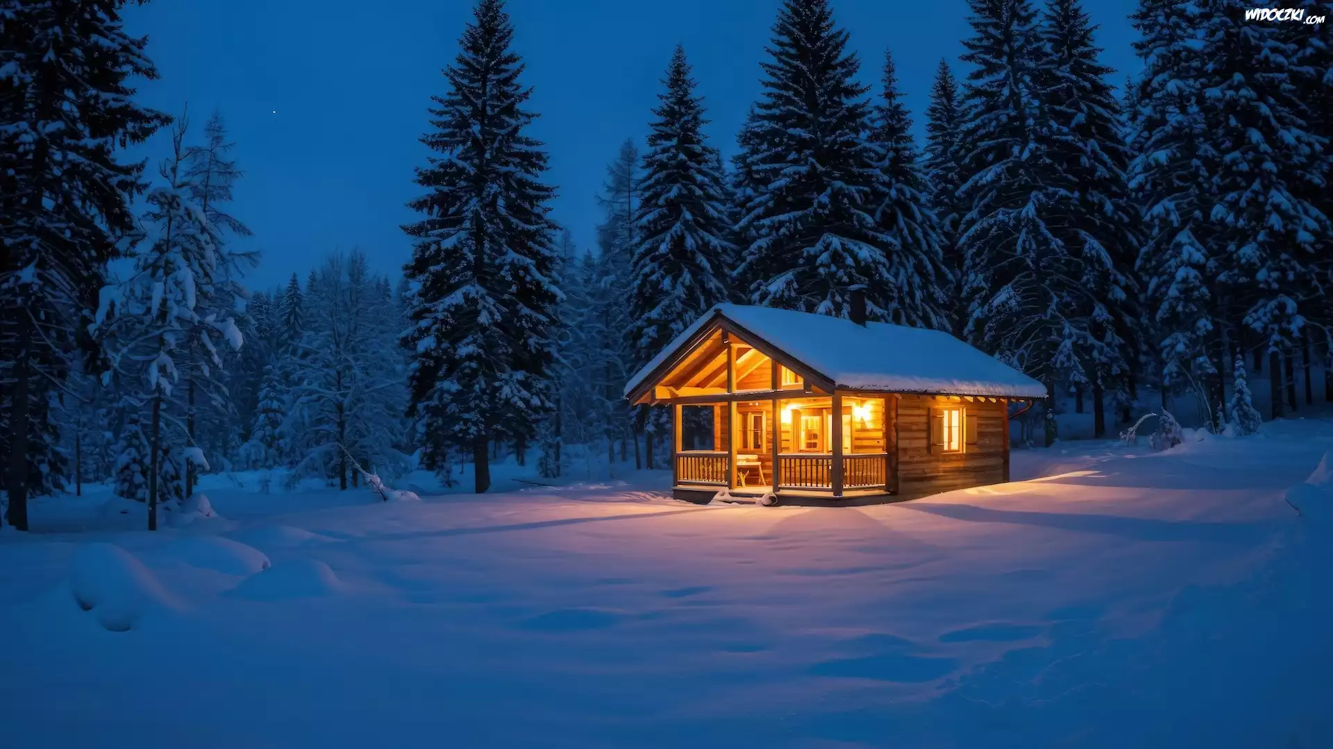 Zdjęcia, Zima, Drewniany, Oświetlony, Dom, Drzewa