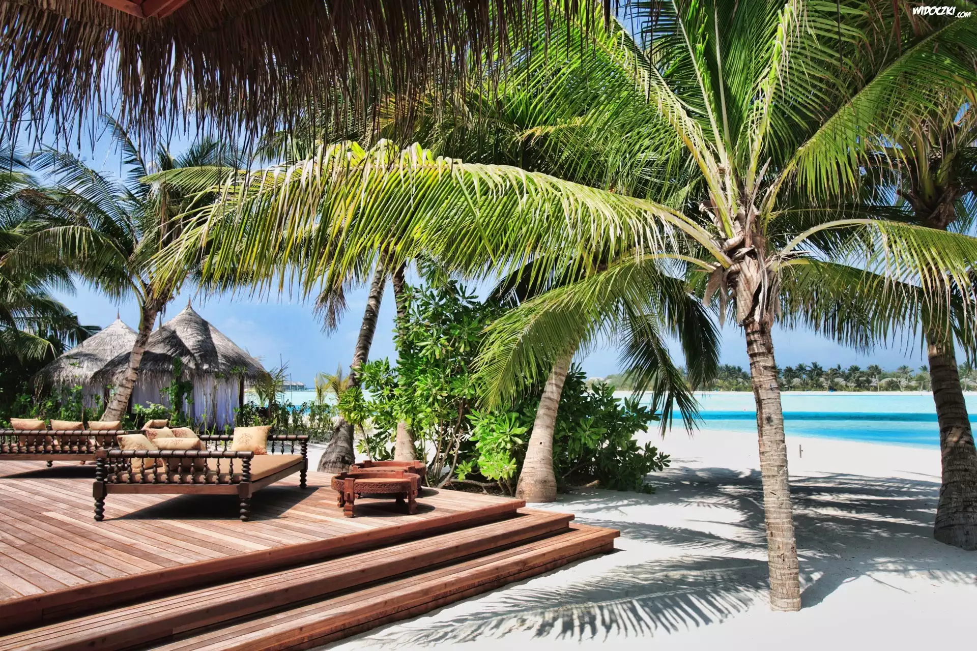 Drewniany, Podest, Chatki, Palmy, Plaża