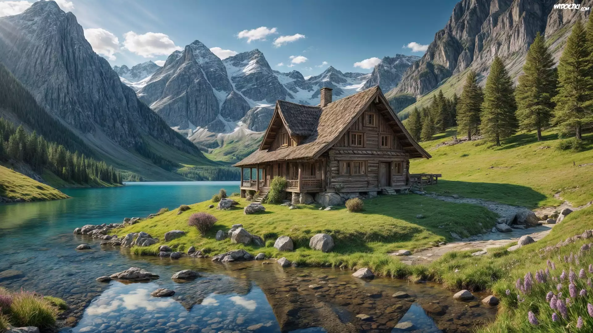 Zdjęcia, Dom, Drewniany, Rzeka, Góry, Grafika